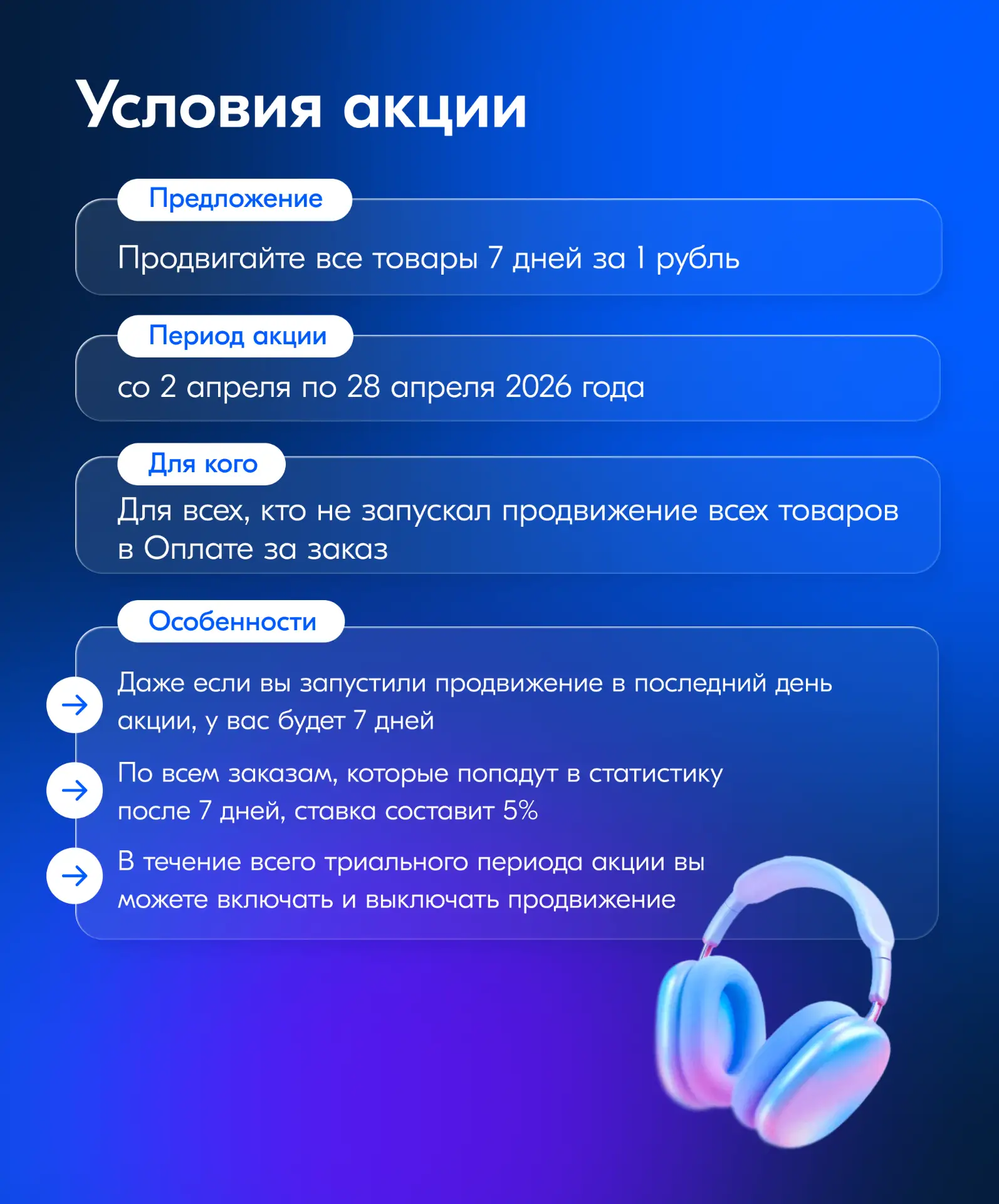 Если вы ещё не продвигали все товары в Оплате за заказ, то можете принять участие в акции — со 2 по 28 апреля. Платите всего 1 рубль за все заказы, которые сделали покупатели в течение 7 дней после запуска продвижения. По истечении этого времени ставка за заказ составит 5% — по всем заказам, которые попадут в статистику после акционной недели. При этом продвижение можно включать и выключать.
