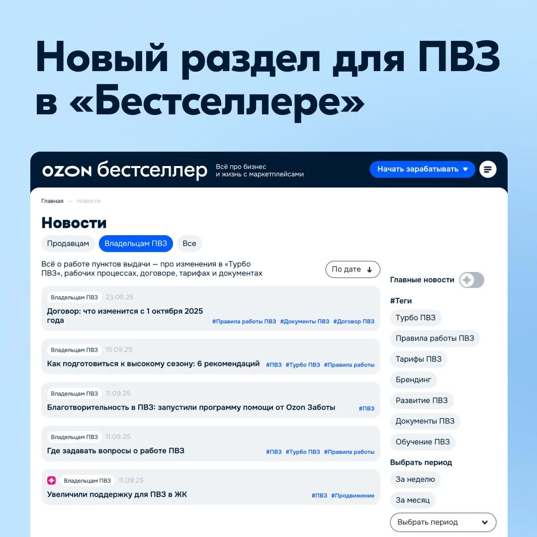 В «Бестселлере» мы раньше публиковали новости только о работе продавцов на Ozon. Чтобы вы тоже могли следить за обновлениями не только в почте или «Турбо ПВЗ», добавили раздел «Владельцам ПВЗ». Будем делиться в нём важными новостями по рабочим процессам пунктов.