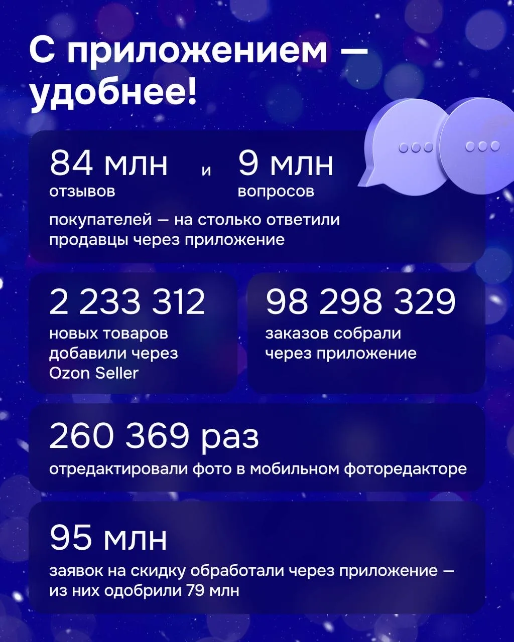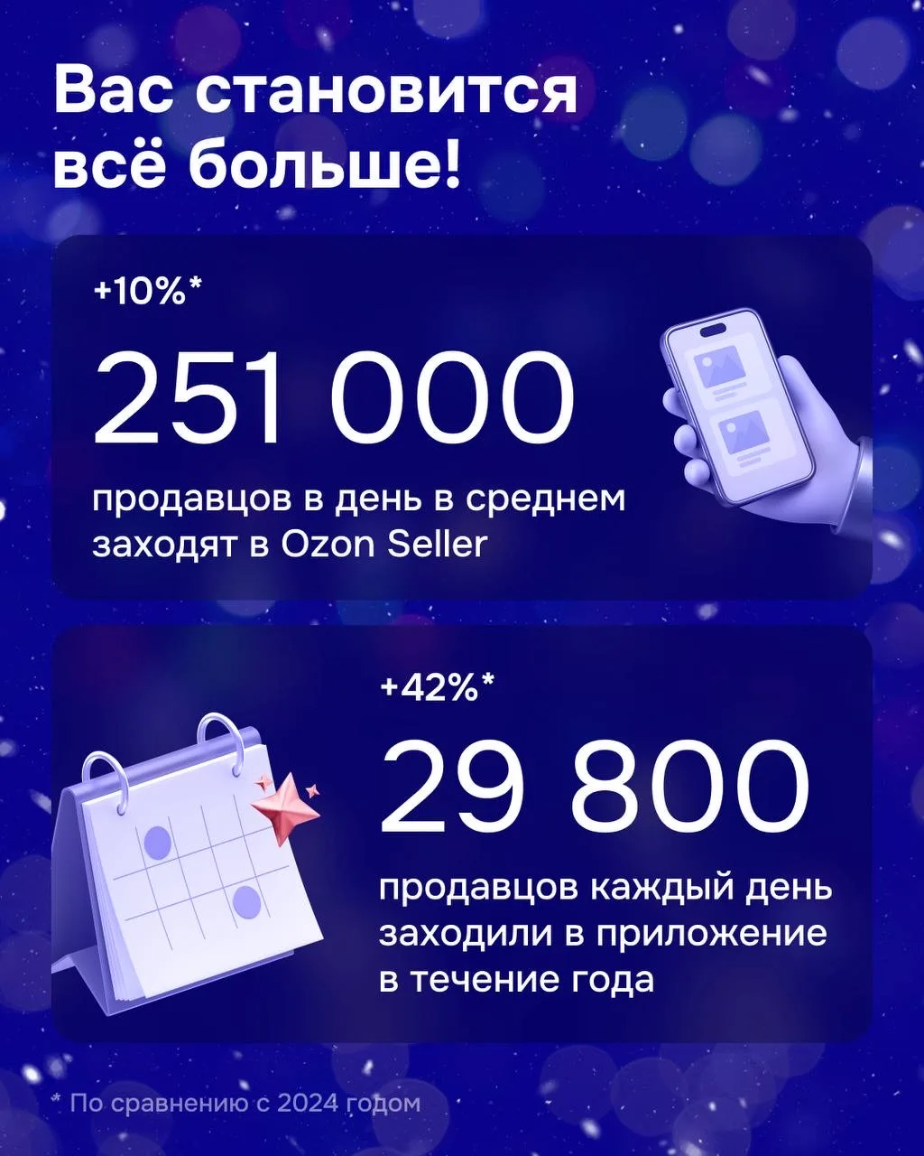 1 104 269 272 — столько минут в сумме провели продавцы в мобильном приложении Ozon Seller в уходящем году. А если перевести эти минуты в годы, получится 2100 лет! И это лишь часть ваших рекордов!