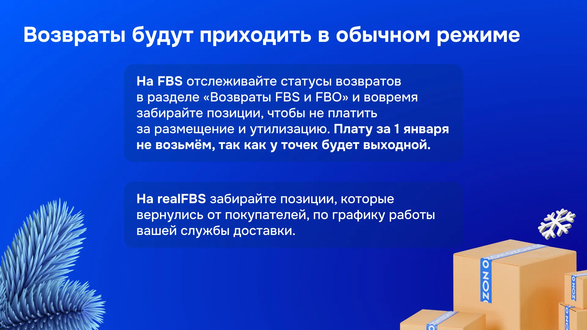 Покупатели могут вернуть товары и в праздники — отслеживайте статусы возвратов в разделе «Возвраты FBS и FBO». Плату за размещение в нерабочие дни начислять не будем, но у вас по-прежнему будет 10 календарных дней, чтобы забрать товары, потом утилизируем их.