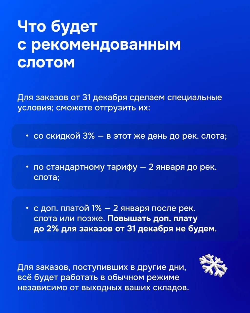 ➡️ Склады. Не будут принимать товары с 8:00 31 декабря до 8:00 2 января. А выдачу вывозов приостановят с 20:00 31 декабря до 8:00 2 января.