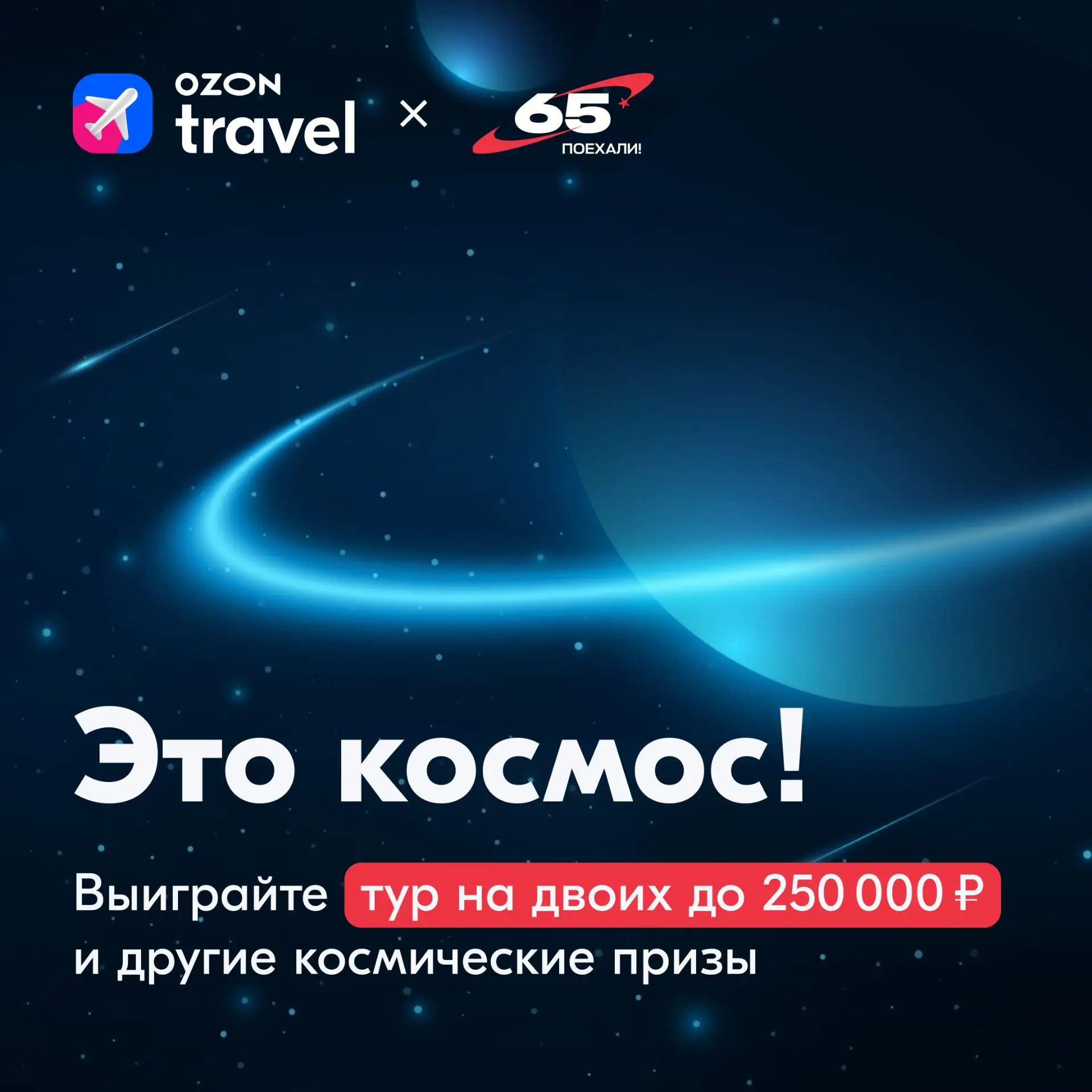 По такому поводу разыгрываем любой тур на двоих до 250 000 ₽, космическое питание и дарим промокоды на скидки и мили от Ozon Travel