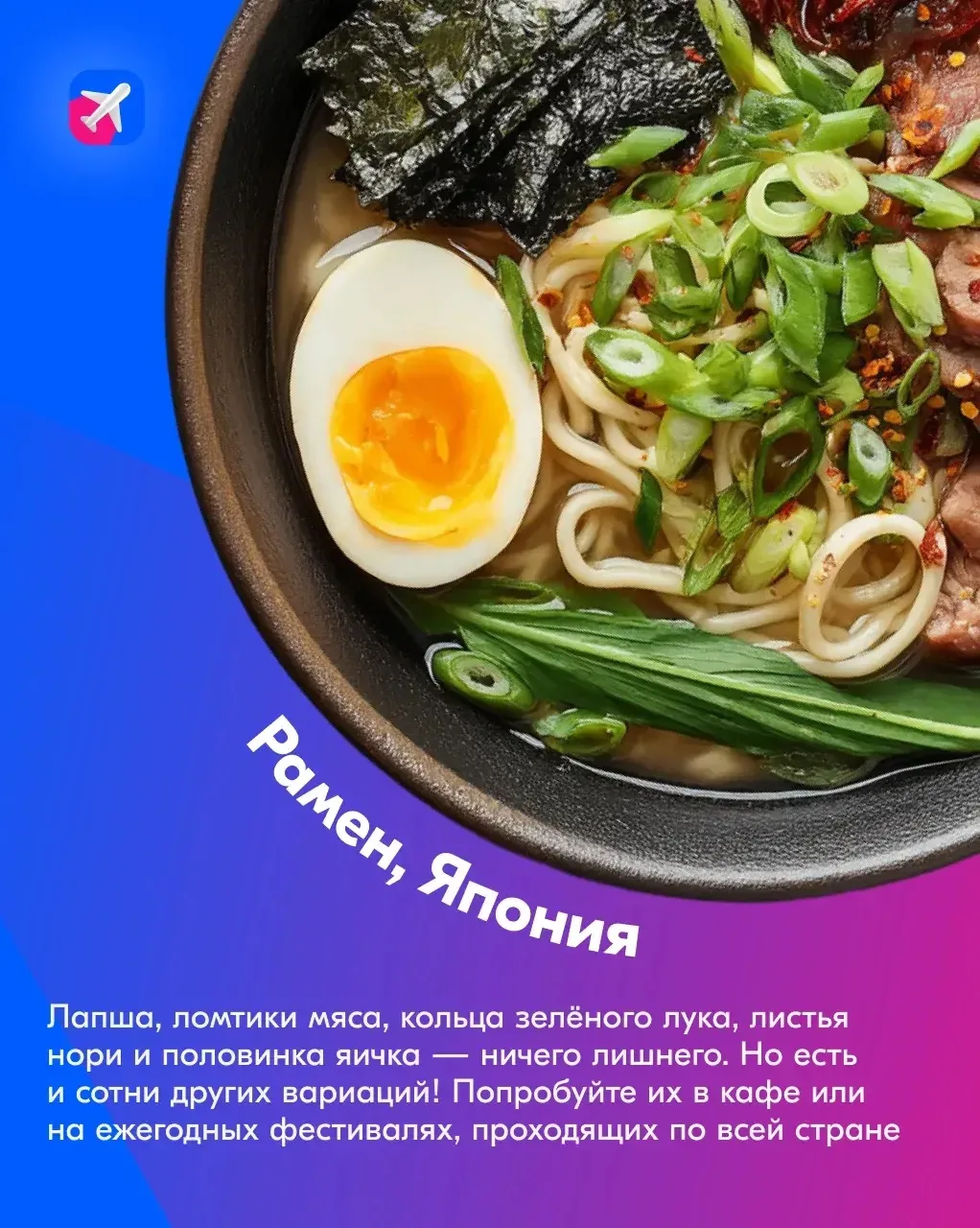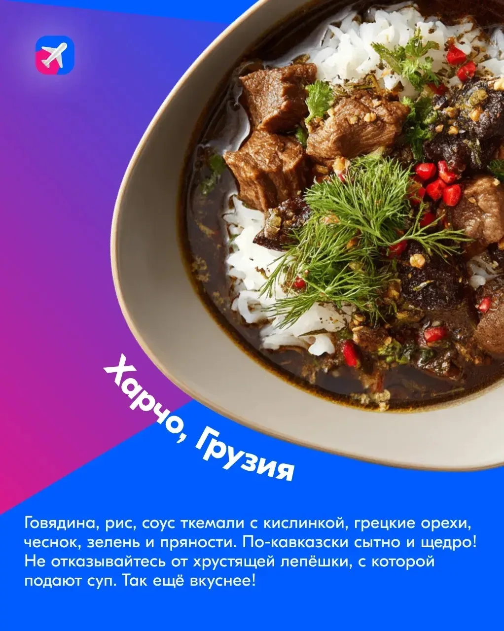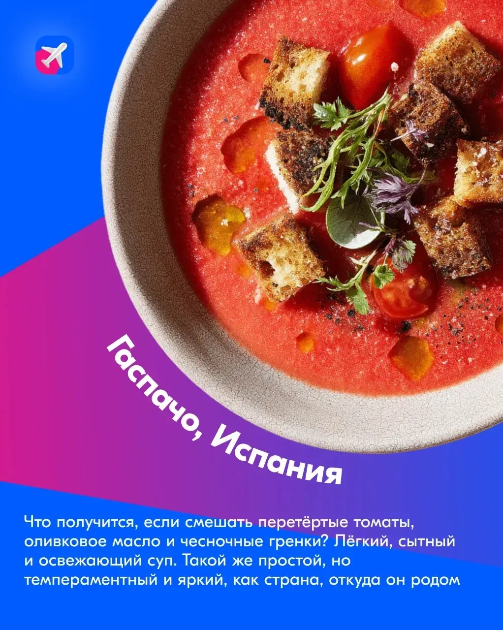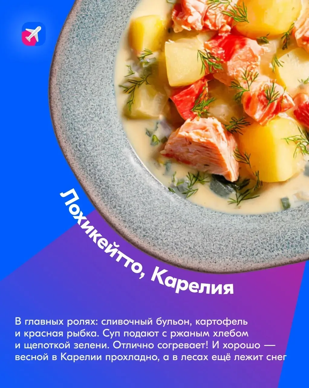⚡️ В карточках оставили описание первых блюд с разных концов света. Эти супы просто супер! Если не любили их в детстве, самое время наверстать. Отправляйтесь есть вкусные Лоххикейто в Карелию, Рамен в Японию, Харчо в Грузию, Том Ям, в Таиланд или Гаспачо в Испанию