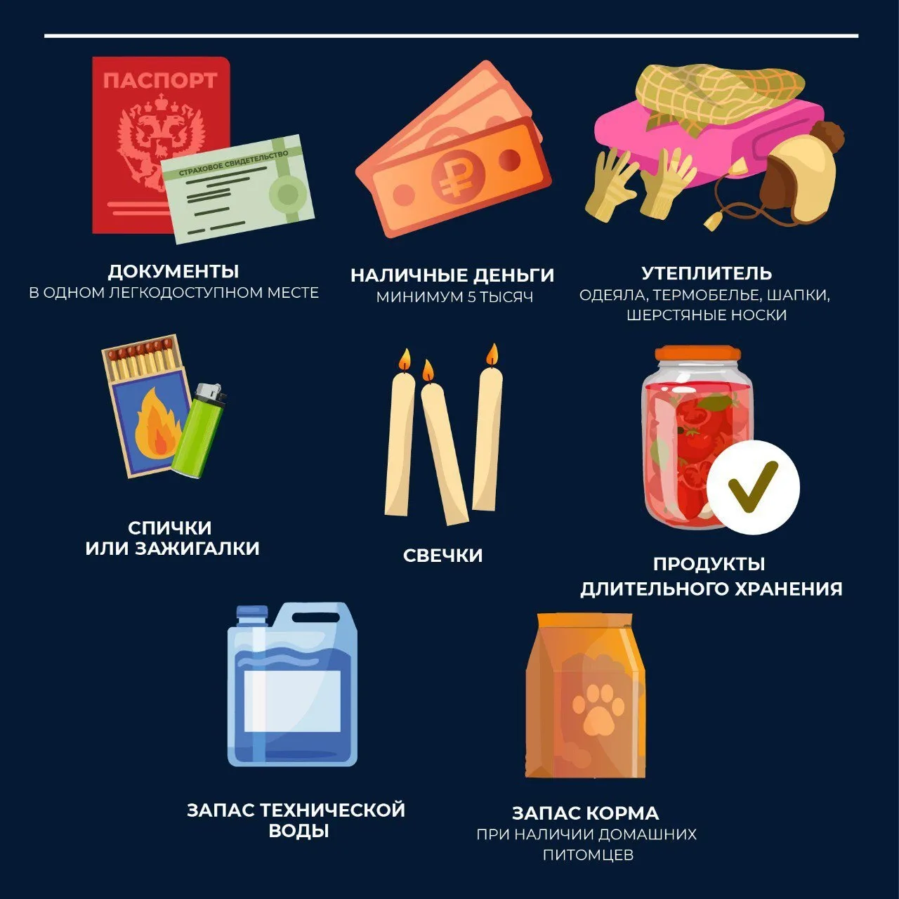 Сохраните карточки себе и передайте близким базовый список важных вещей на случай ЧС.