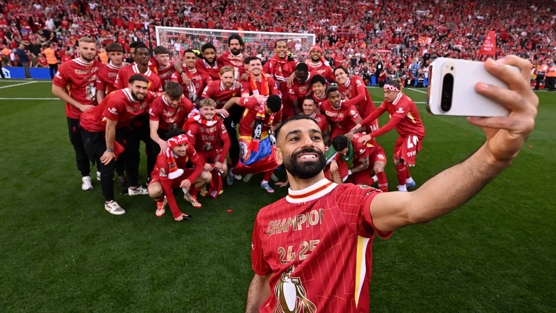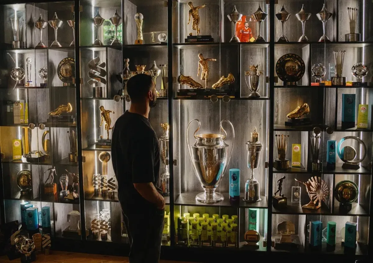 Мохамед Салах любуется выигранными трофеями в составе «Ливерпуля».