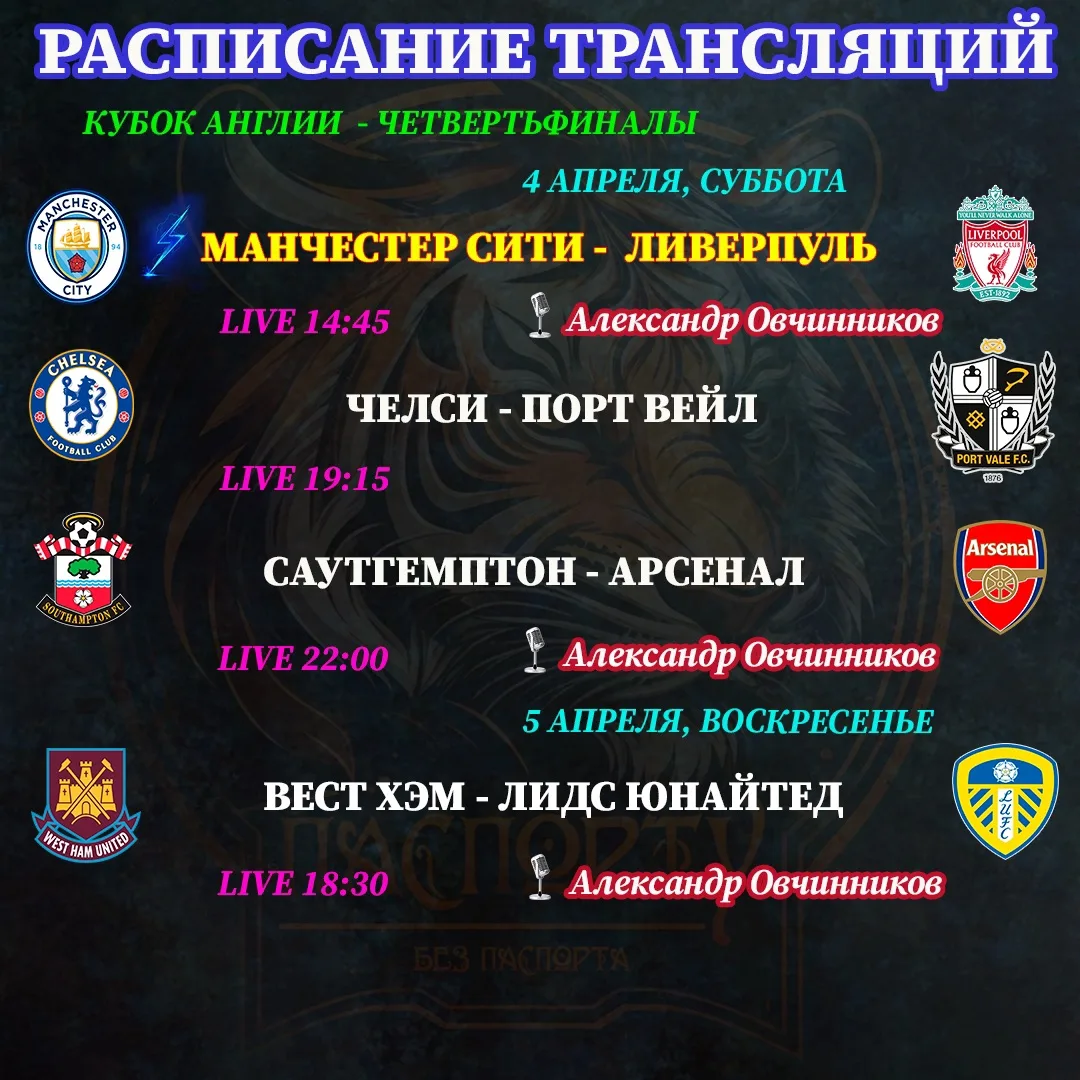 ⚔️ Уже завтра стартуют четвертьфинальные матчи кубка Англии, а ваш любимый канал Паспорту обязательно покажет их все!