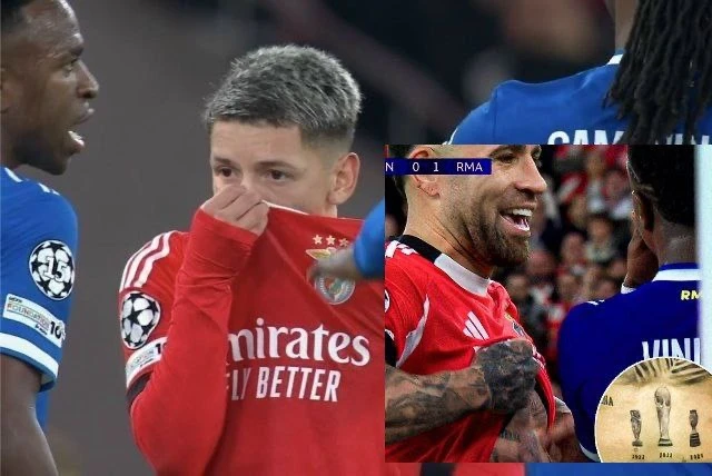 🤯 В матче Лиги Чемпионов Винисиус Джуниор забил гол красивым обводящим ударом и побежал его праздновать перед обозлёнными фанатами «Бенфики», что разумеется спровоцировало конфликт - в одном из эпизодов футболист «Бенфики»Престианни прикрылся футболкой и обозвал Винисиуса.