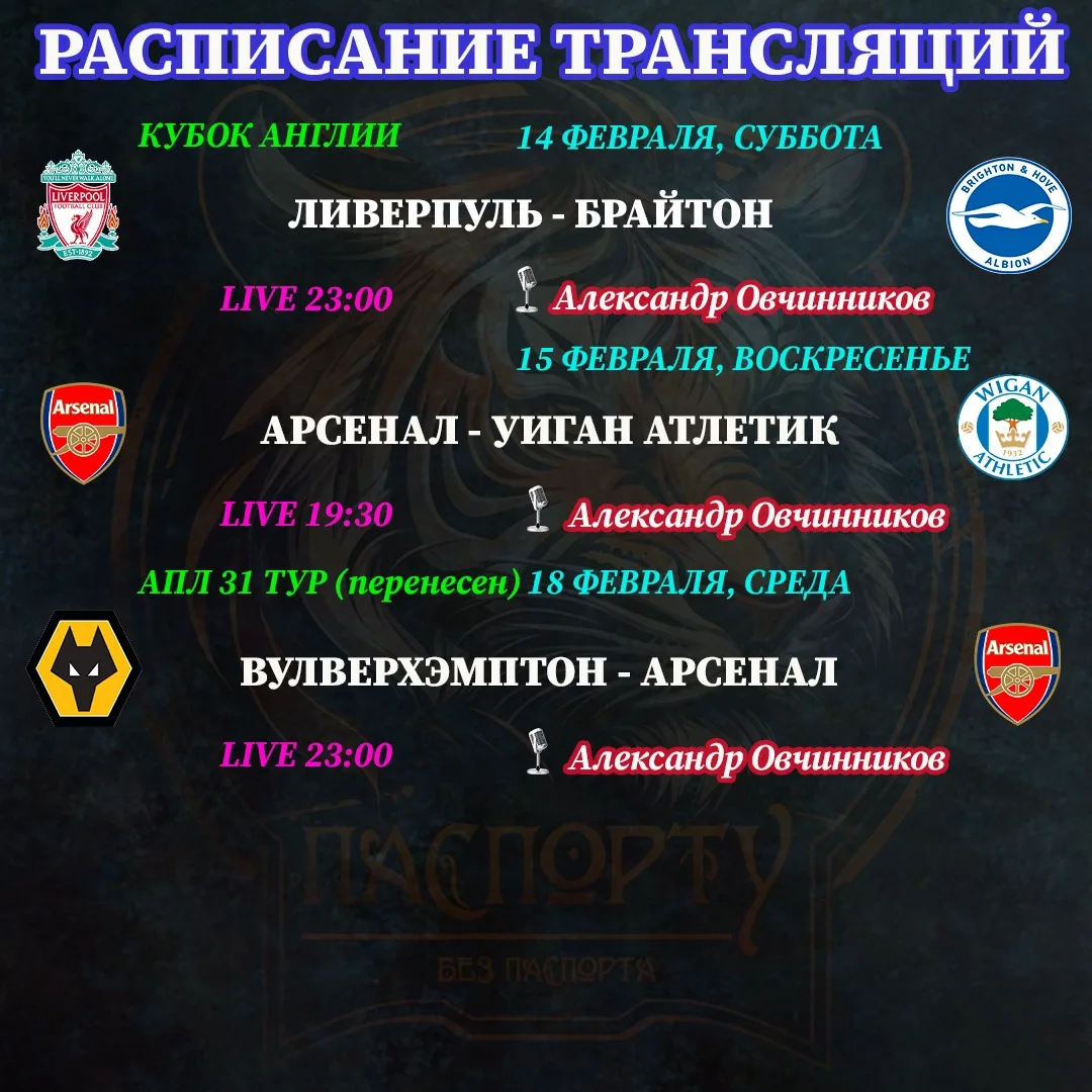 📺 Ловите расписание ближайших трансляций! На этих выходных наш ждет Кубок Англии, а в среду посмотрим перенесенную игру «Арсенала« с «Вулверхэмптоном!»