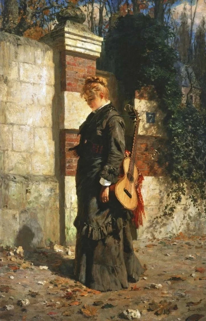 На картине молодая женщина, прислонившись к каменной ограде, выглядит так, словно сама жизнь покинула её. Её волосы цвета воронова крыла, четко очерченные брови и густые черные ресницы контрастируют с матовой бледностью лица. Кажется, она вот-вот упадет в обморок от душевной боли. Эта героиня не просто изображение — это символ, воплощающий страсть, предательство и разочарование.