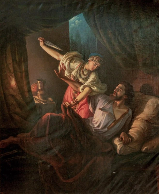 На холсте запечатлён один из самых драматичных эпизодов летописей Древней Руси. Рогнеда, княжна из Полоцка, когда-то посмела отвергнуть Владимира Святославовича — того самого, кто впоследствии будет крестить Русь. Он не простил её смелости: захватил Полоцк, истребил её семью и против воли женился на ней. Даже в таком положении Рогнеда не смирилась — она задумала отомстить. На картине показан тот самый момент её отчаянной попытки — кульминация, переданная Грибковым с мощным эмоциональным накалом.