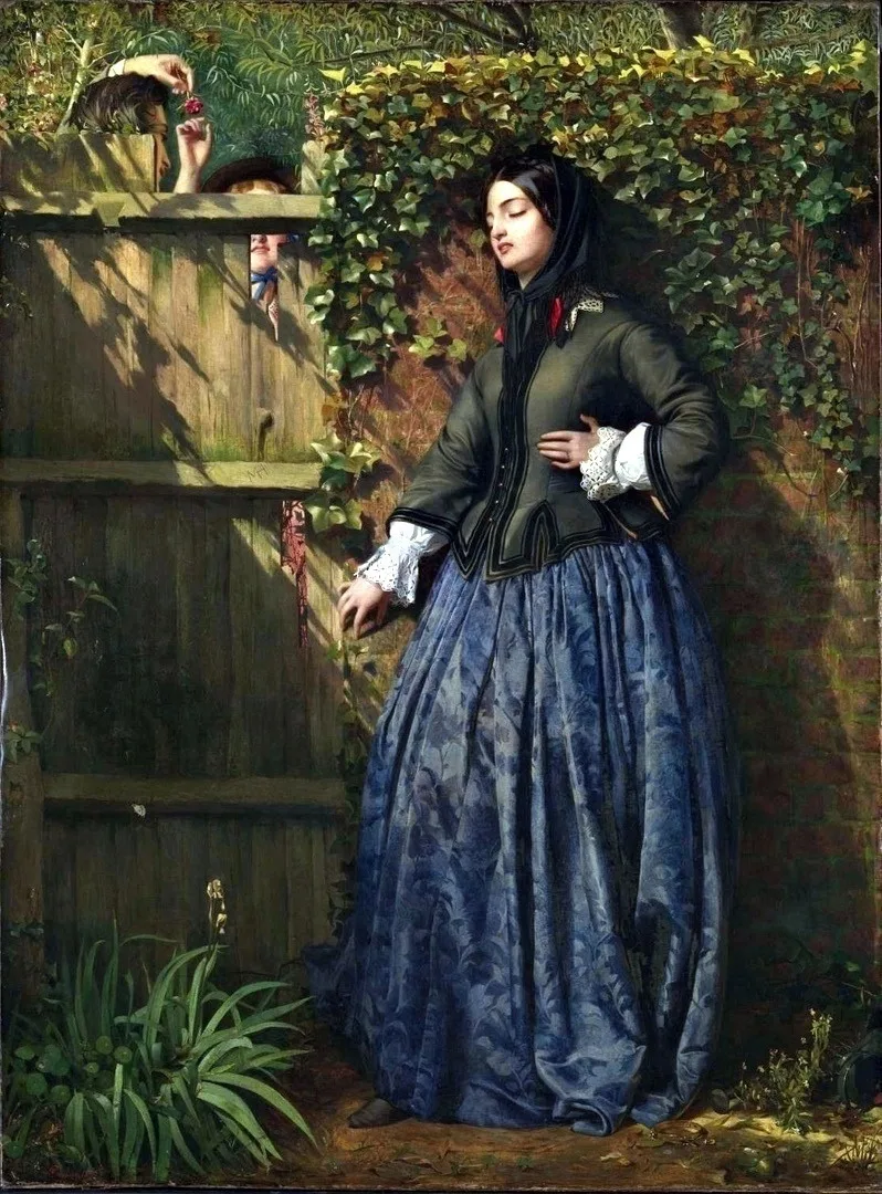 Кальдерон, испанец по происхождению и представитель прерафаэлитов, мастерски создает атмосферу, в которую хочется погрузиться. На заднем плане мы видим двух любовников, скрывающихся за поломанной изгородью. Муж чернобровой красавицы флиртует с другой барышней, дразня её цветком, который она пытается схватить. Эти детали, словно шепот, подсказывают о том, что происходит за закрытыми дверями — о том, как легко рушатся обещания и как сложно смириться с потерей.