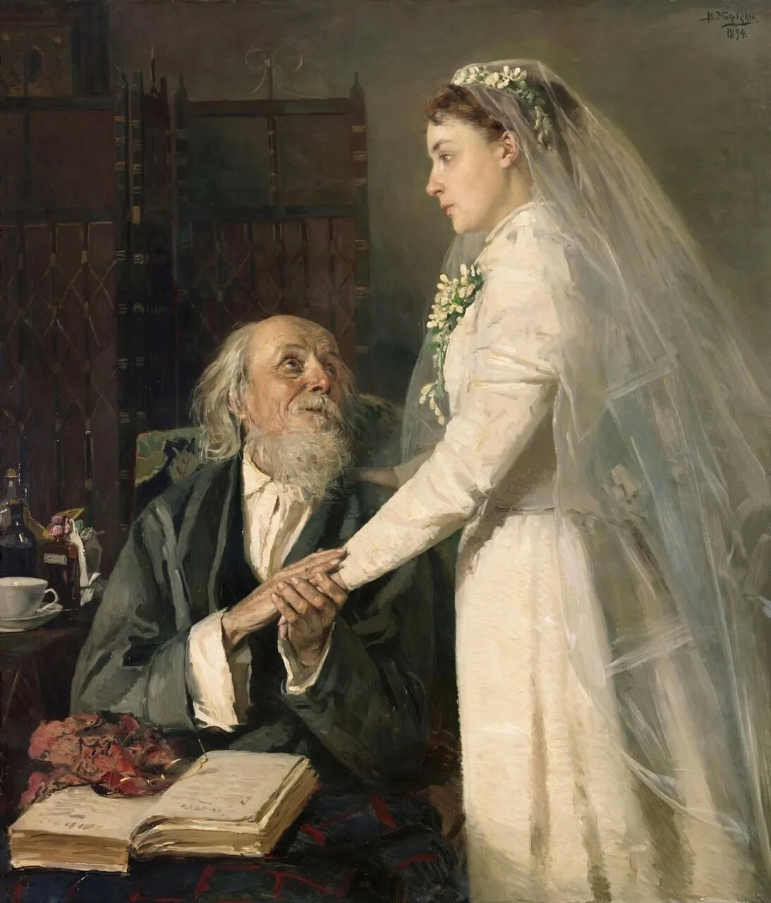 Смотрю на картину Владимира Маковского «К венцу. Прощание», и сердце замирает от увиденного. Передо мной старик с трогательным взглядом, полным нежности и боли, и его дочь, погруженная в свои чувства. Эти мгновения, запечатленные на холсте, словно отражают целую гамму человеческих эмоций — от любви до безысходности. Глядя на эту работу, понимаешь, насколько сложными могут быть человеческие отношения, особенно когда речь идет о браке.