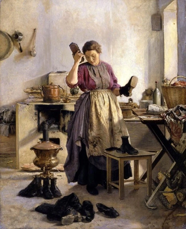 Иван Лаврентьевич мастерски передал детали деревенского быта второй половины XIX века. Кухонная утварь, рукомойник, ключи от сундуков, высоко висящие на гвозде, — каждое из этих предметов словно шепчет о жизни, которую жили и помнили наши предки. Деревянный пол намекает на то, что семья не жила в нужде, а печь, требующая побелки, говорит о том, что это время года — весна, когда крестьяне готовятся к Пасхе, следуя старинным традициям.