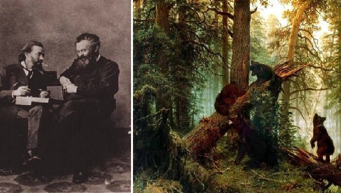 Знаменитых медведей на картине Шишкина «Утро в сосновом лесу» написал художник Савицкий. Ну не получались у гениального мастера пейзажа эти забавные звери. Но и гонорар в четыре тысячи рублей от продажи этой картины был разделен по-братски, да и автографов изначально было на полотне два. Все по-справедливости...