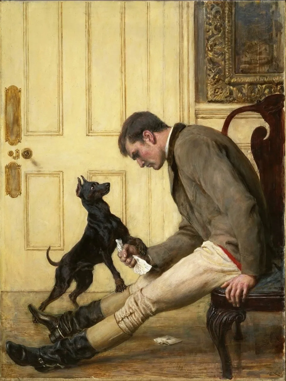 Ривьер мастерски передает сложные человеческие эмоции через простые детали. Посмотрите на позу молодого человека — его сжатая рука, выражение лица, полное отчаяния. Сравните это с расслабленной, уверенной позой собаки, которая, кажется, знает, что именно сейчас ее поддержка необходима больше всего.