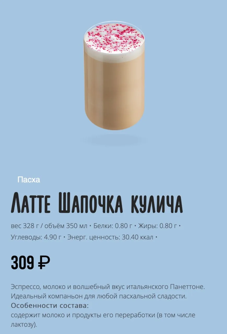 Латте со вкусом шапочки от кулича появился в сети Цех85. Обещают весенний вкус итальянского праздничного десерта Панеттоне, который почти невозможно перепутать.