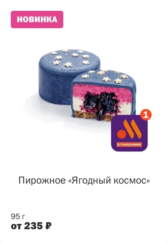 Во «Вкусно — и точка» завезли новинку ко Дню космонавтики. Пирожное «Ягодный космос» — это два слоя мусса из черной смородины и ванили с начинкой из смородины и ежевики. Украшено звездами и стоит 235 рублей.