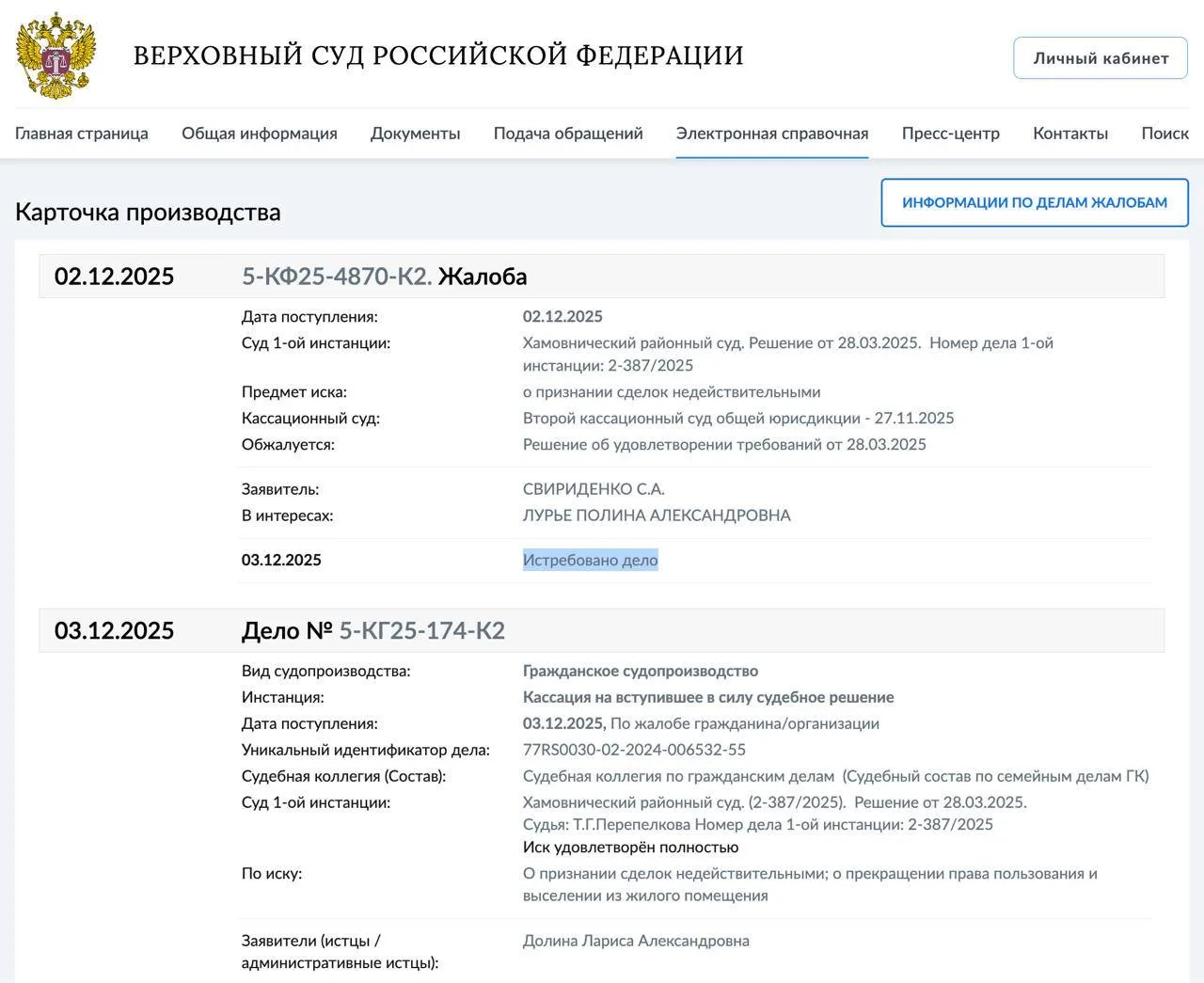 ‼️ Верховный Суд РФ истребовал дело против Ларисы Долиной. Это означает, что решение по нему может быть пересмотрено по результатам проверки.