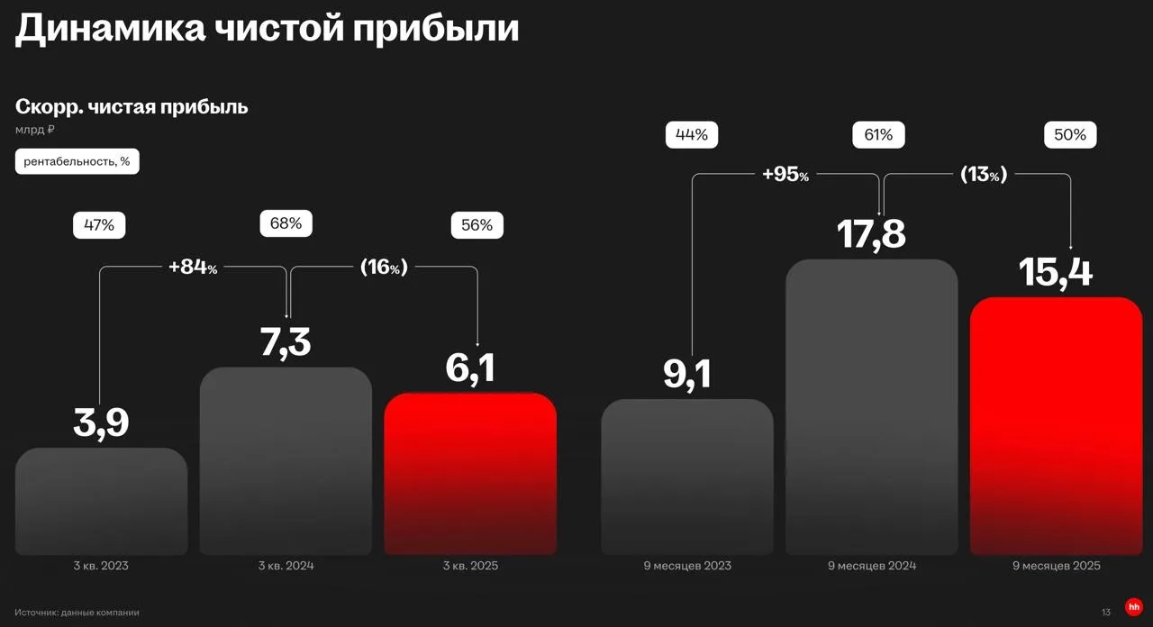 📊 Настоящая беда кроется в прибыли и свободном денежном потоке (FCF). Так, скорректированная чистая прибыль за 9 месяцев упала вдвое, с 27,9 млрд до 13,7 млрд руб. Всё из-за растущих процентных расходов (+55% г/г). Компания платит за долг больше, чем за рекламу и персонал вместе взятые.