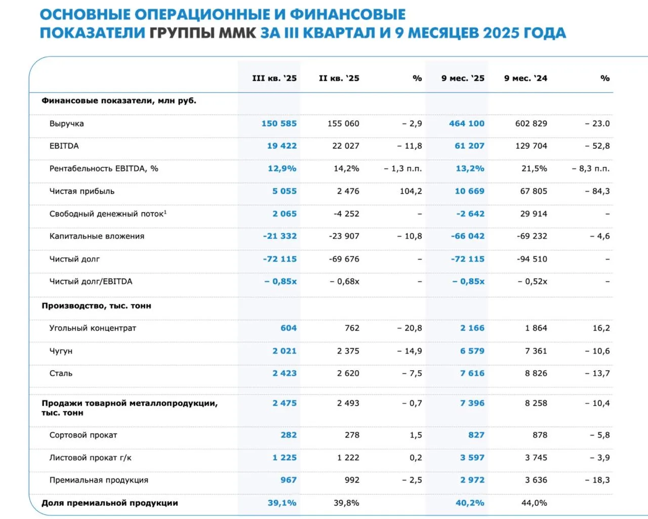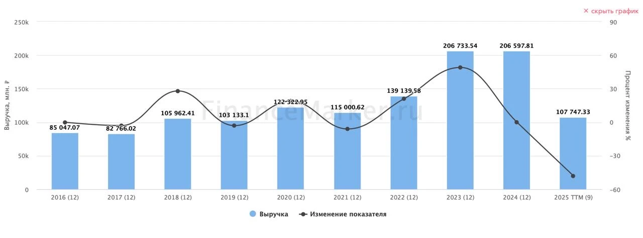 🏭 Итак, выручка компании снизилась на 17% до 49,3 млрд рублей. EBITDA рухнула вдвое – до 11,8 млрд, маржа просела с 40% до 24%. При этом чистая прибыль составила всего 2,1 млрд (в 6 раз меньше прошлогодних уровней). Свободный денежный поток снова отрицательный – минус ₽3,6 млрд. Формально долговая нагрузка минимальная (NetDebt/EBITDA ~0,8), но кэша для акционеров от этого больше не становится.
