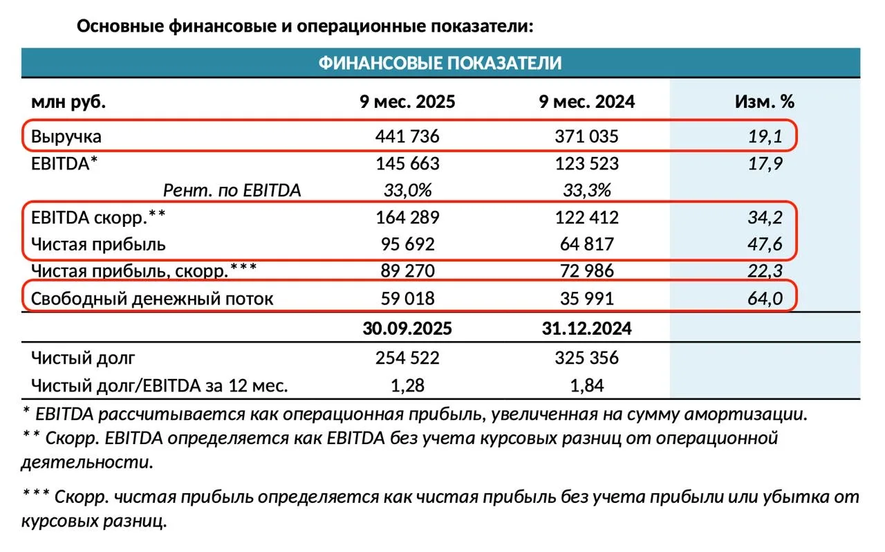 По оценке Российской ассоциации производителей удобрений (РАПУ), экспорт минеральных удобрений за 9 месяцев 2025 года вырос на 8% до 33,7 млн тонн. При этом растет и погрузка химических и минеральных удобрений по сети РЖД. Так, рост за январь-октябрь составил 35,6 млн тонн (+21,4% г/г). Объемы растут, но что с финансами у Фосагро, давайте разбираться.