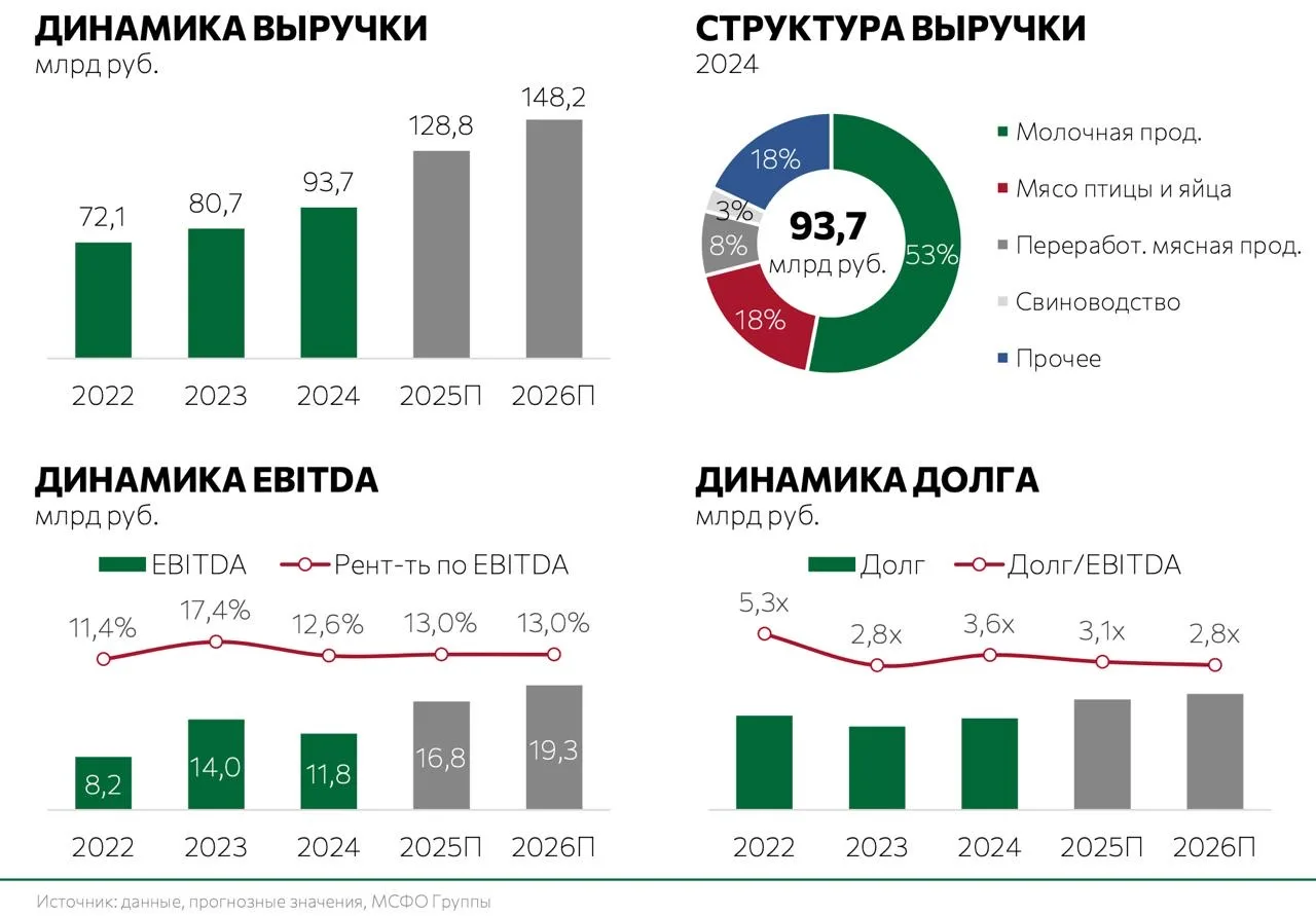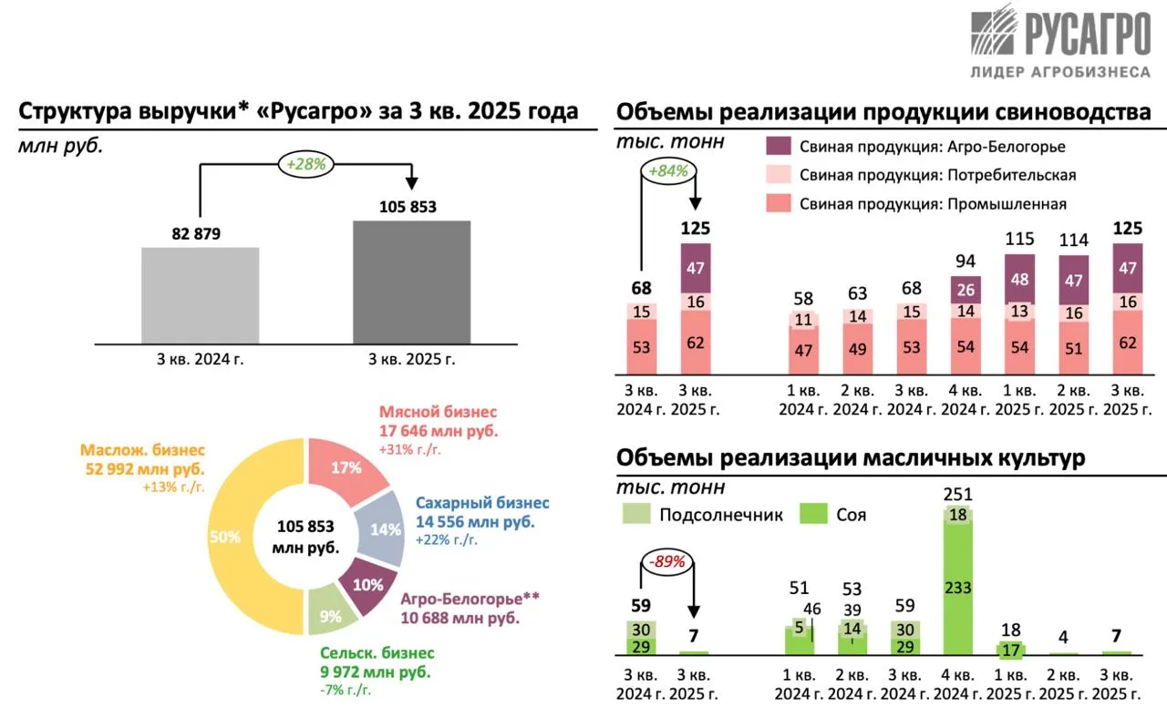Существенный вклад в выручку, порядка 20 ярдов, внес синергетический эффект от консолидации ГК Агро-Белогорье. Мясной сегмент тоже растет, выручка по итогам полугодия выросла на 21% до 27,3 млрд рублей. Только во втором квартале 2025 года прирост объемов реализации продукции свиноводства составил +52 тыс. тонн.