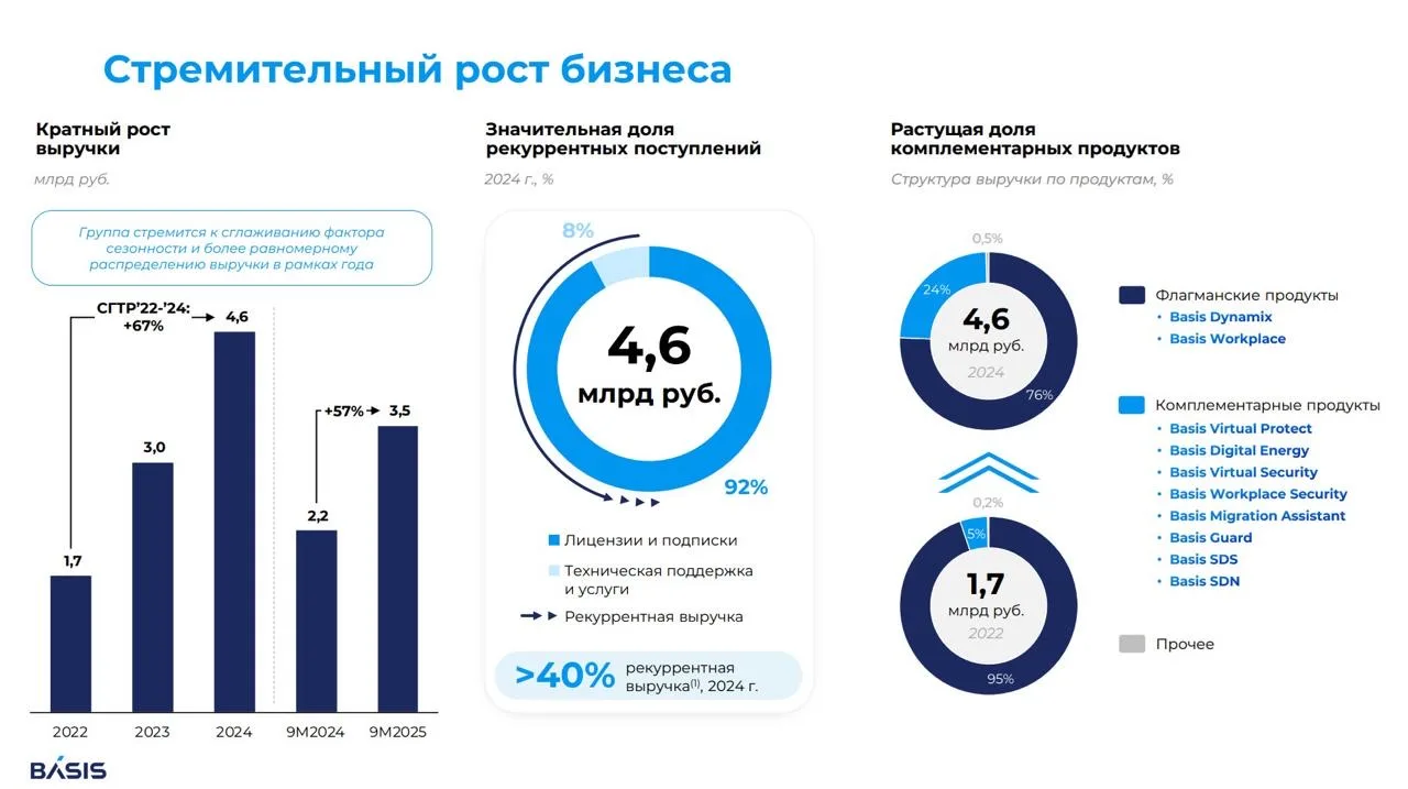 Размещение акций ниже фундаментальной стоимости бизнеса должно привлечь внимание инвесторов. Интерес к IPO Базиса должен быть высоким, учитывая, что компания является национальным лидером на рынке программного обеспечения для управления динамической ИТ-инфраструктурой. По итогам первых девяти месяцев 2025 года компания увеличила выручку и чистую прибыль на 57% и 35% соответственно, что является лучшим результатом среди публичных ИТ-компаний.