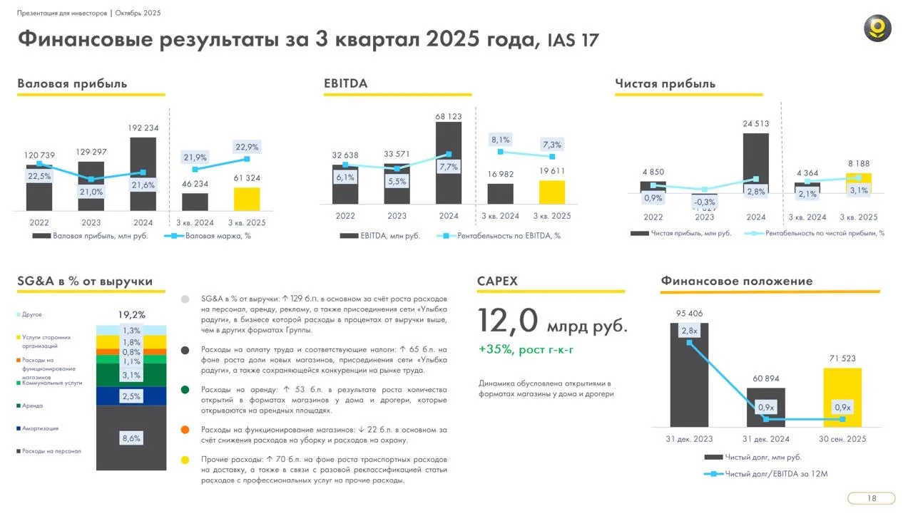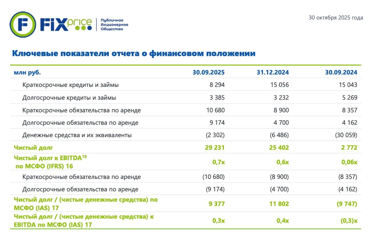 Причиной столь высоких финансовых расходов является чистый долг с учетом аренды и повышенная нагрузка за счет ставки ЦБ. За отчетный период долг снизился с 30,2 млрд до 25,5 млрд рублей, однако все еще остается высоким. Соотношение чистого долга к EBITDA на конец июня 2025 года достиг 1,8x.