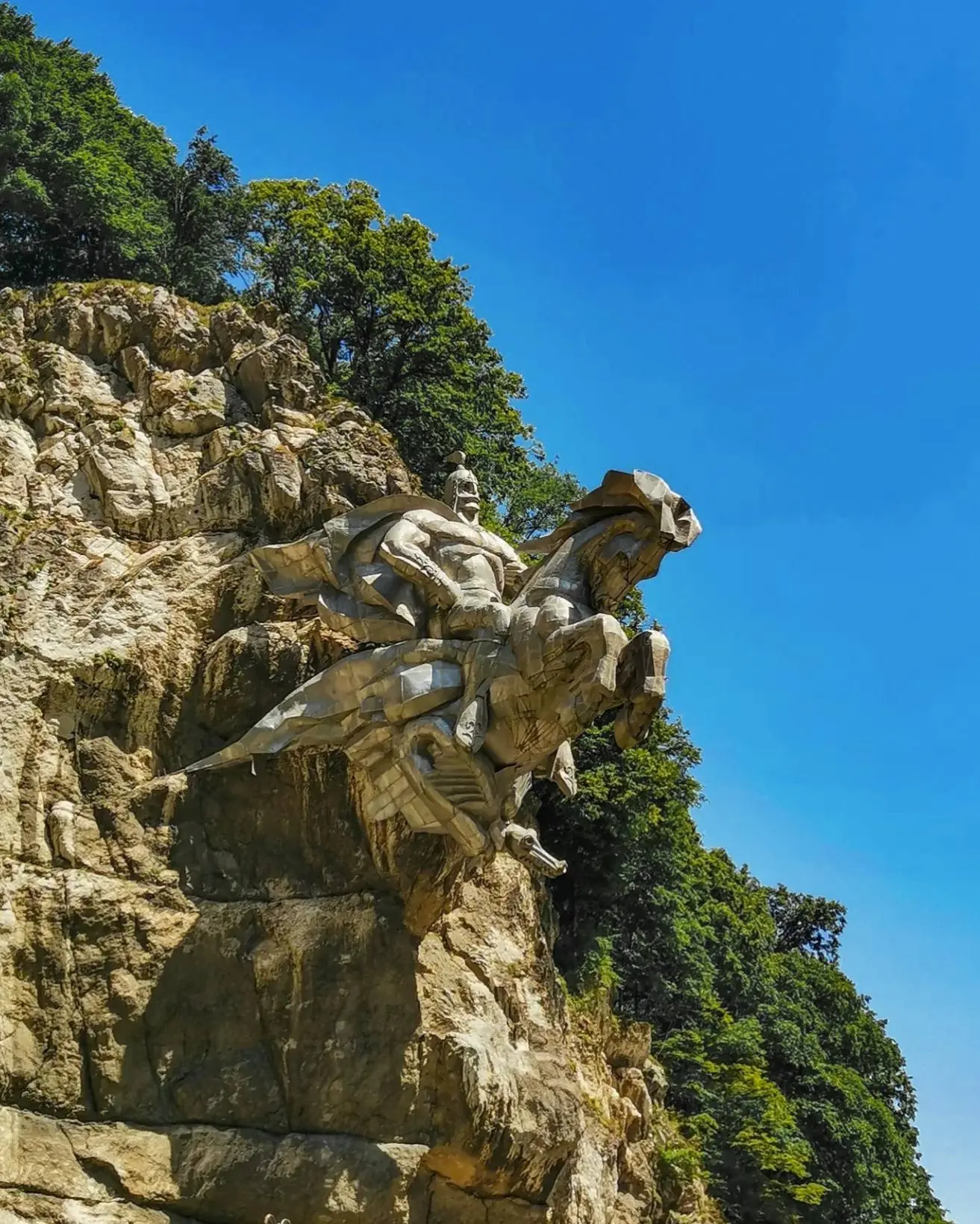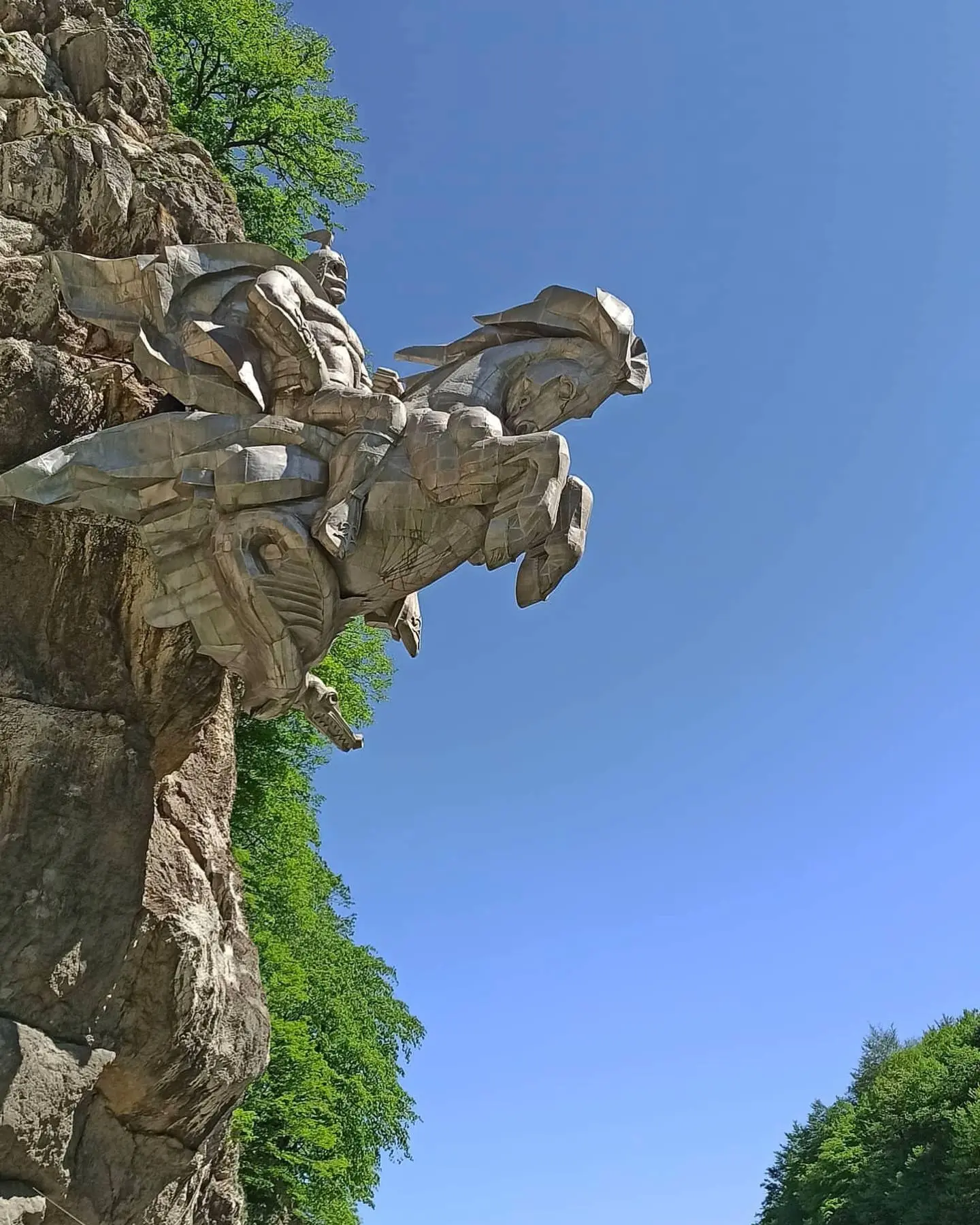 Конь с седоком в шлеме и широкой бурке будто насквозь пронзает скалу и вылетает прямо над дорогой. Уастырджи в осетинской традиции считается покровителем мужчин, воинов и путников. С появлением на этой территории христианства Уастырджи стал прочно ассоциироваться с православным святым Георгием Победоносцем.