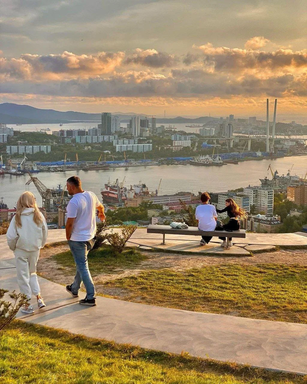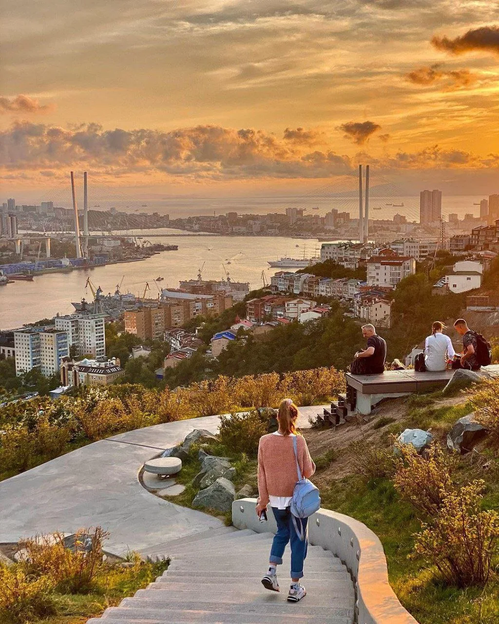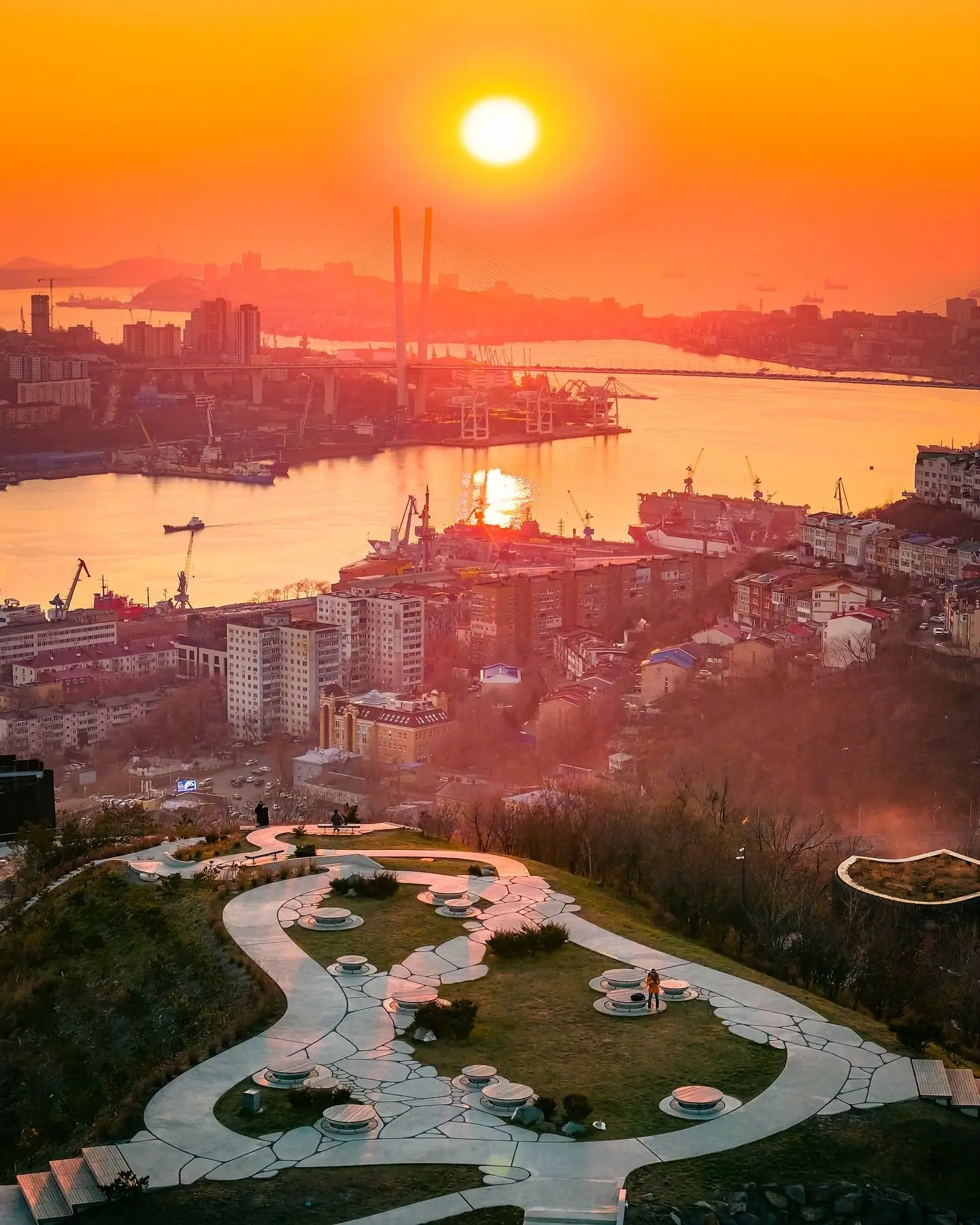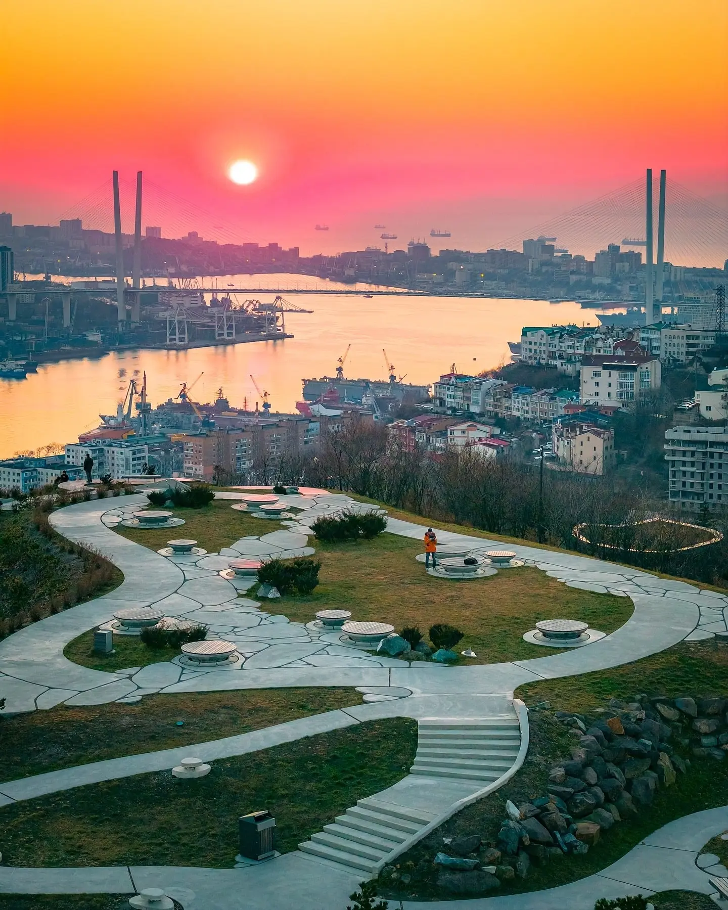 Нагорный парк в центре Владивостока сейчас выглядит как современное и очень приятное пространство для прогулок. Он находится на одной из сопок города, откуда открываются широкие виды на бухту Золотой Рог, порт, районы и дороги. Смотровых точек здесь много, и почти с каждой открываются отличные виды.