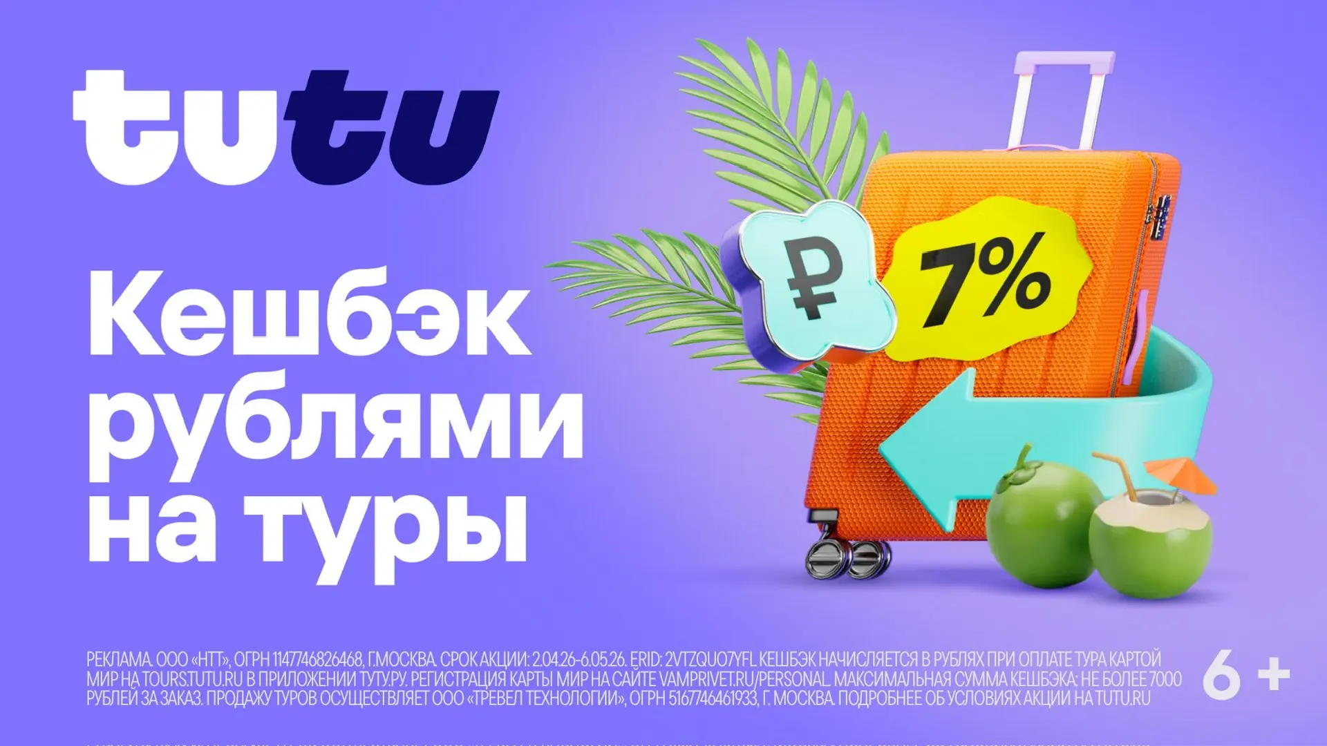 Целый месяц в сервисе путешествий Туту можно купить любой тур и получить кешбэк до 7% рублями на карту.