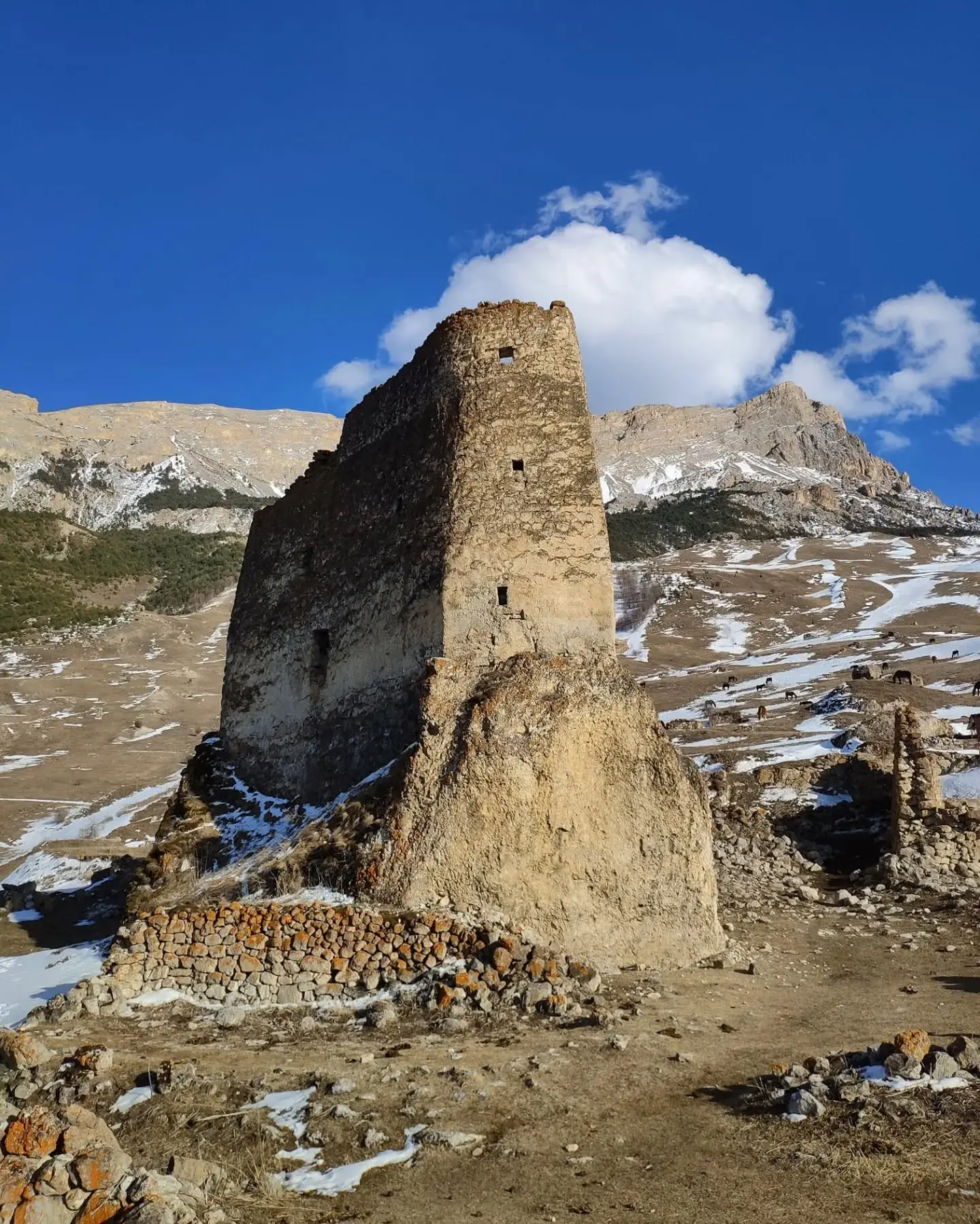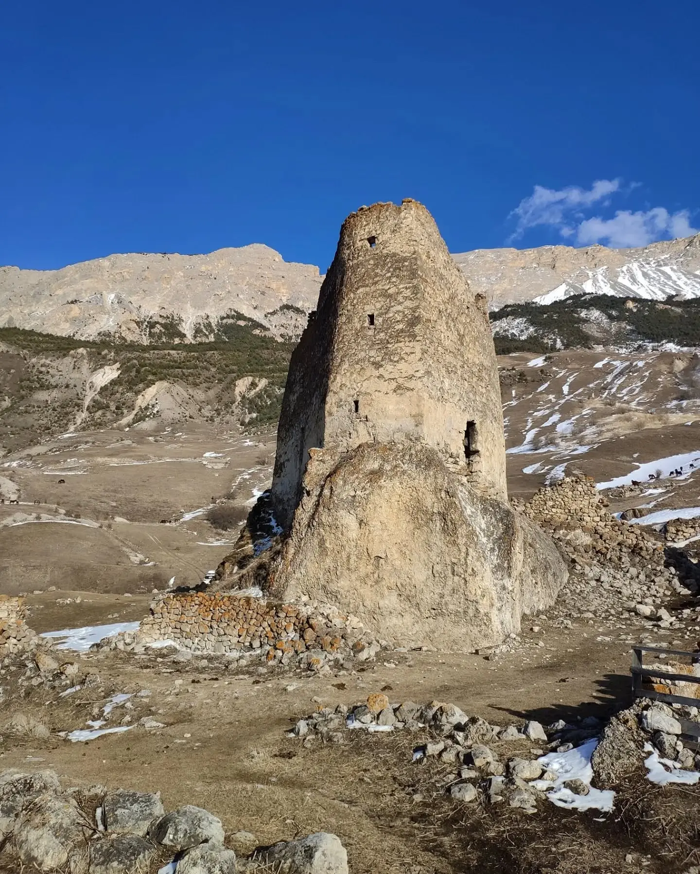 Если быть точнее, от замка сохранилась только башня. Её возвели примерно в XIV–XVI веках на высоте около 2 000 метров. Скорее всего, сооружение выполняло военно-оборонительную функцию — об этом говорят многочисленные бойницы.