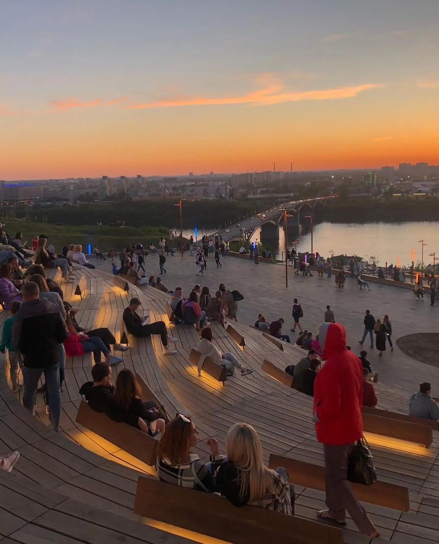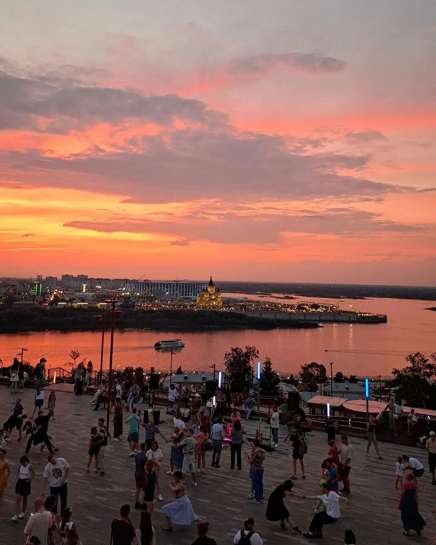 Во-первых, солнце садится прямо в районе стрелки Волги и Оки, и это уже само по себе впечатляет. Во-вторых, высокий берег города открывает потрясающие виды на закат. Здесь множество точек, откуда можно наблюдать это зрелище, и ничто не мешает обзору.