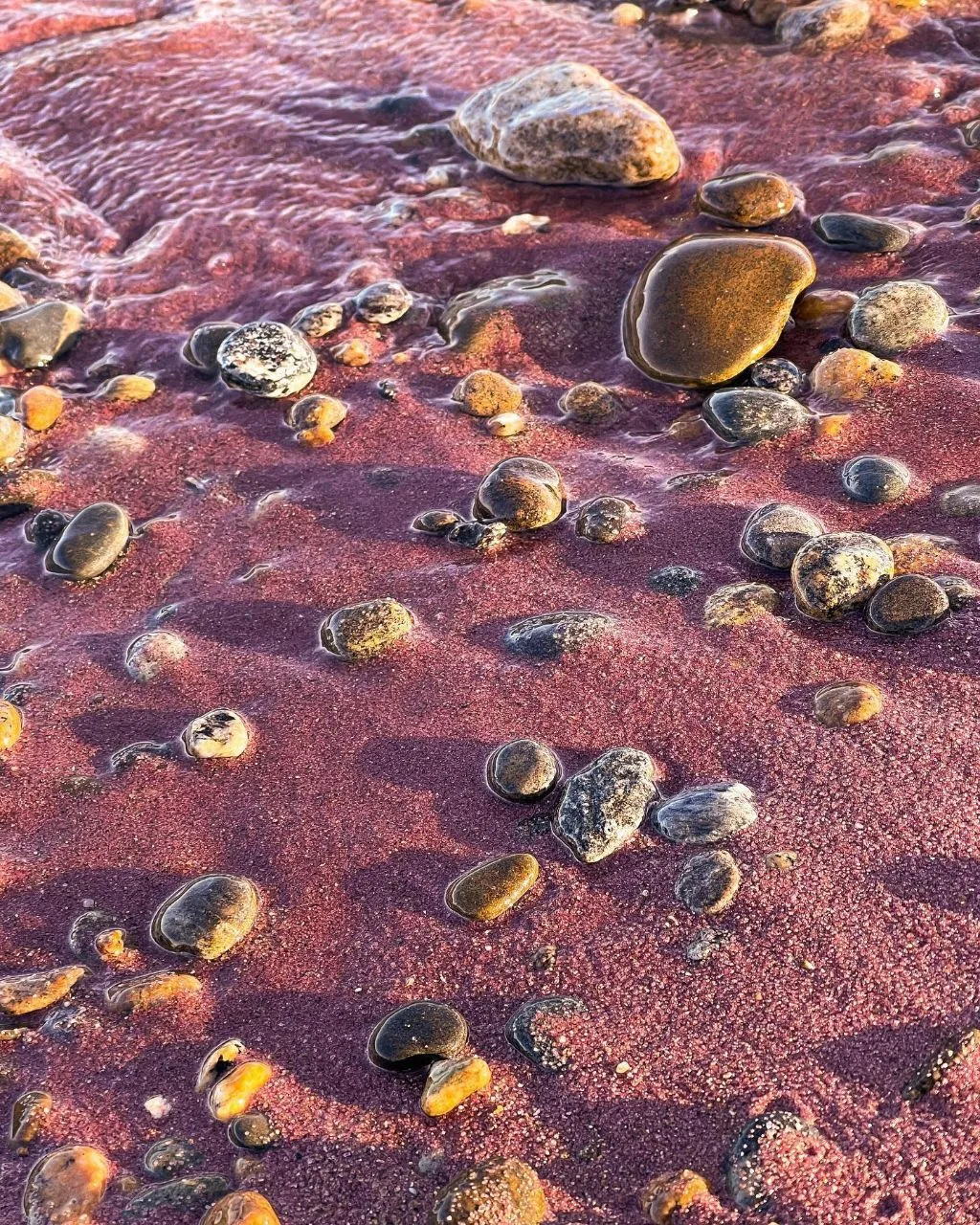 Песок состоит из мелких частиц минерала граната альмандина, вымытого ручьями из ближайших гор. В зависимости от наличия солнца и влажности его оттенок может разниться.
