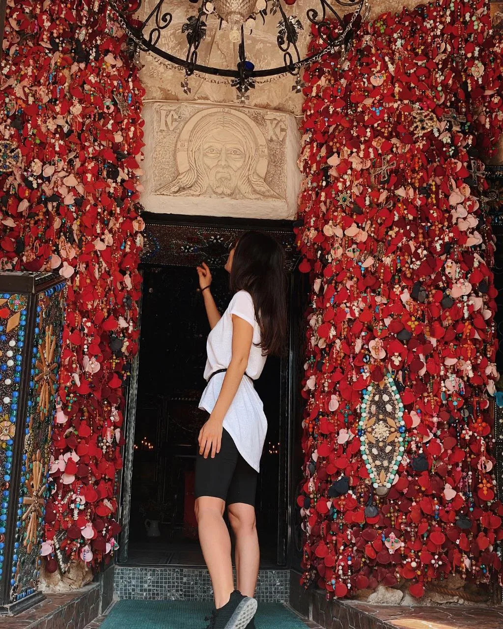 Необычное убранство делает церковь настоящим произведением искусства. Внутри можно увидеть бисерные панно, разноцветные лампады и тысячи крестов из ярких бусин. К каждому из них привязан маленький красный мешочек с завязками. В храме существует особая традиция: паломники пишут записки со своими желаниями, кладут их в мешочек, привязывают к кресту и оставляют у входа.