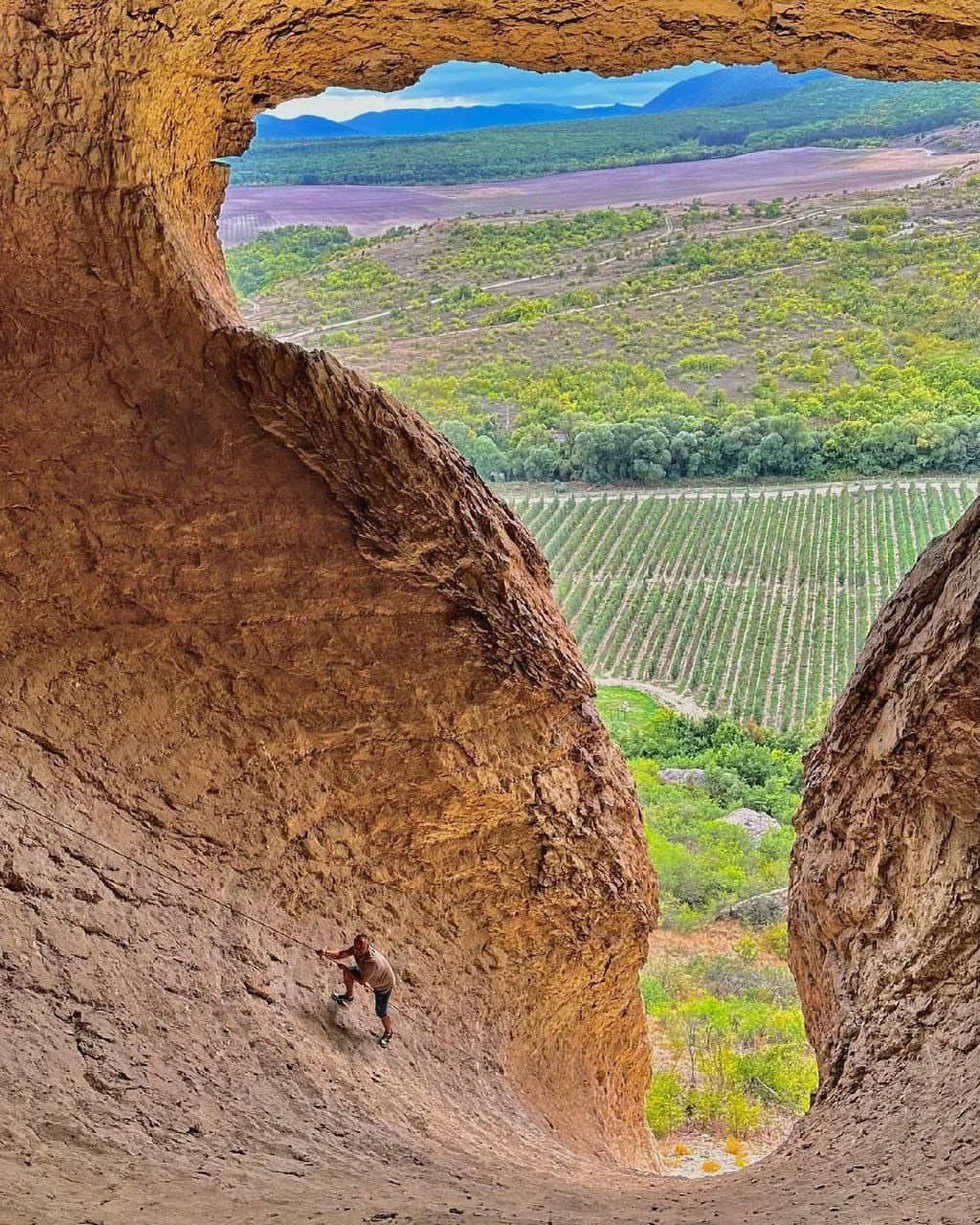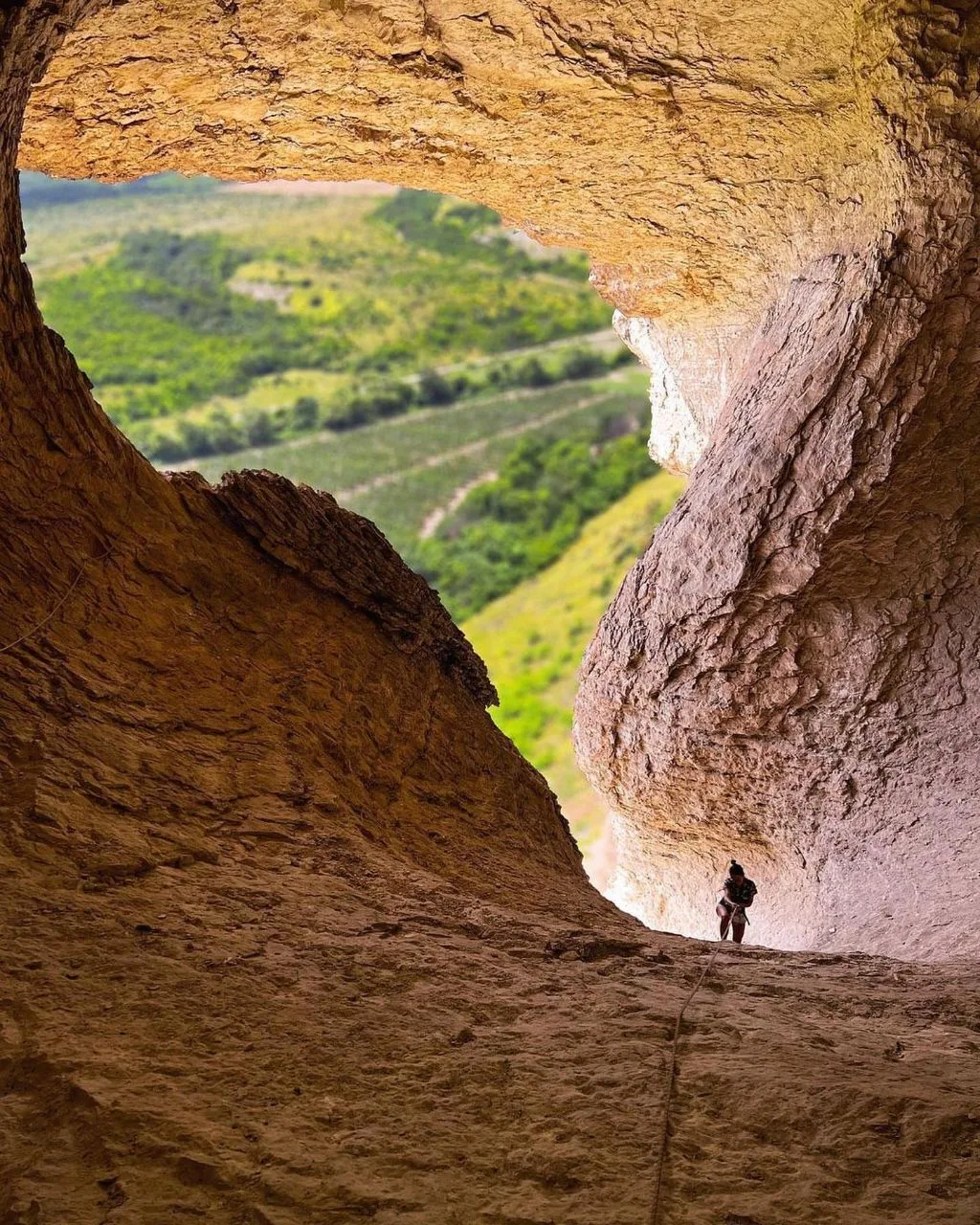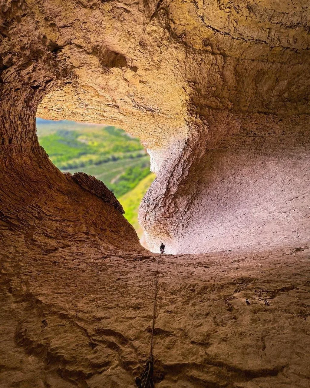 Под обрывистым склоном находятся несколько гротов. Самый интересный из них вы видите на фото. Благодаря своей форме Акчора-Кобасы работает как естественная акустическая система, звук здесь не только отражается, но и усиливается.⠀
