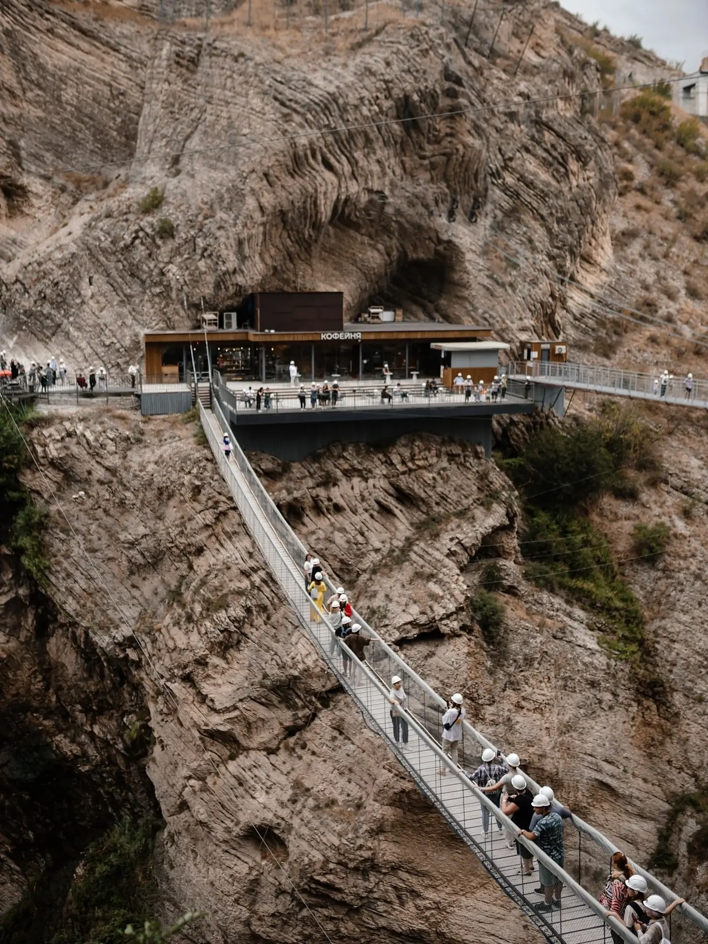 К скалам ведёт подвесной мост, который сам по себе стал точкой притяжения для путешественников. Чтобы увидеть самые эффектные виды, стоит пройтись по нему пешком или проехать на машине. Для пешеходов проход бесплатный, владельцам автомобилей придётся заплатить 70 рублей.