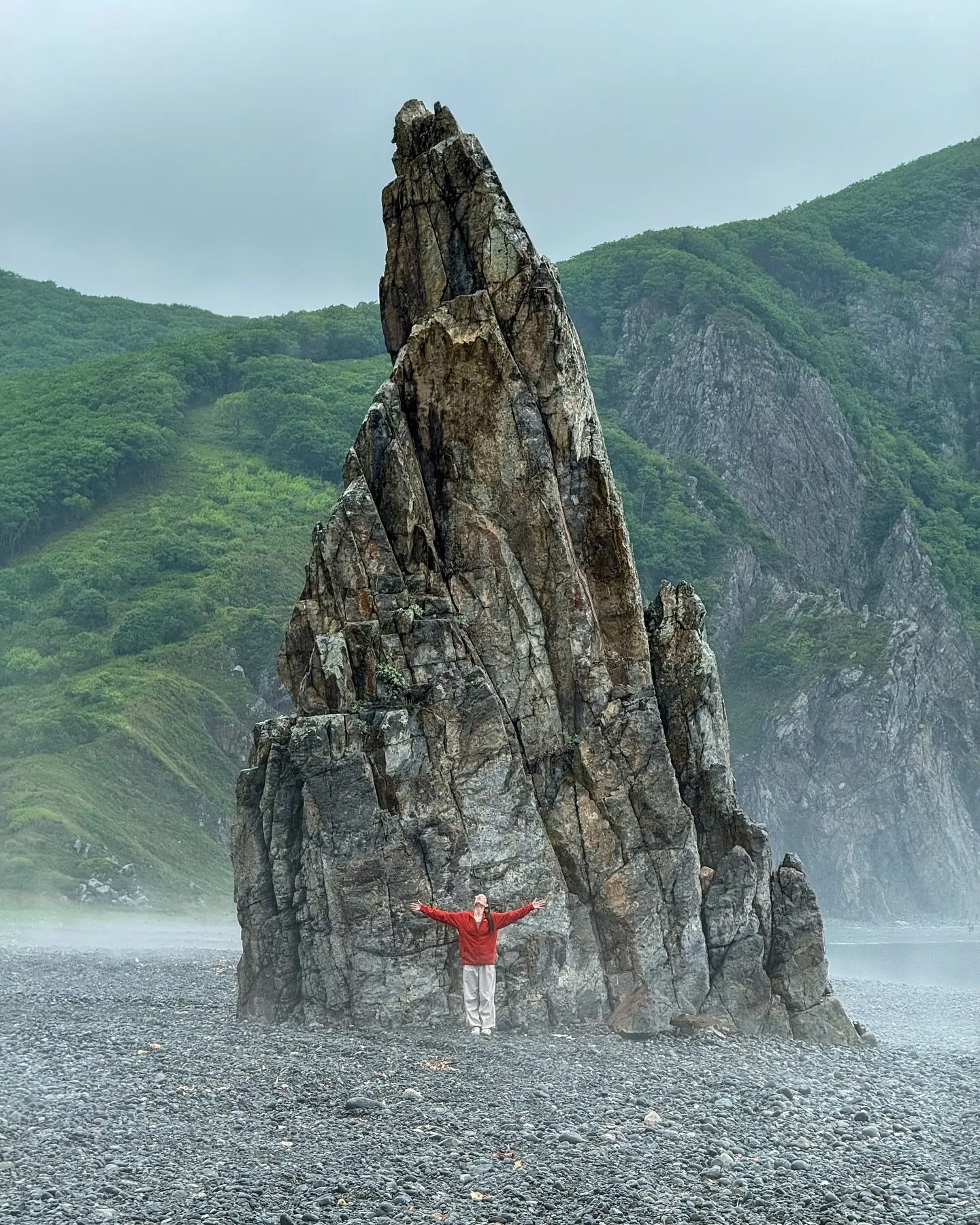 Бухта Дубовая давно стала точкой притяжения туристов и одним из самых впечатляющих локаций Приморья. Исполинские столбы, арки и пещеры создают ощущение, будто ты оказался среди гигантских скальных бастионов. На их фоне чувствуешь себя песчинкой, особенно когда розоватые скалы уходят вверх, в синее небо. При этом сама бухта небольшая, с уютным песчаным пляжем.