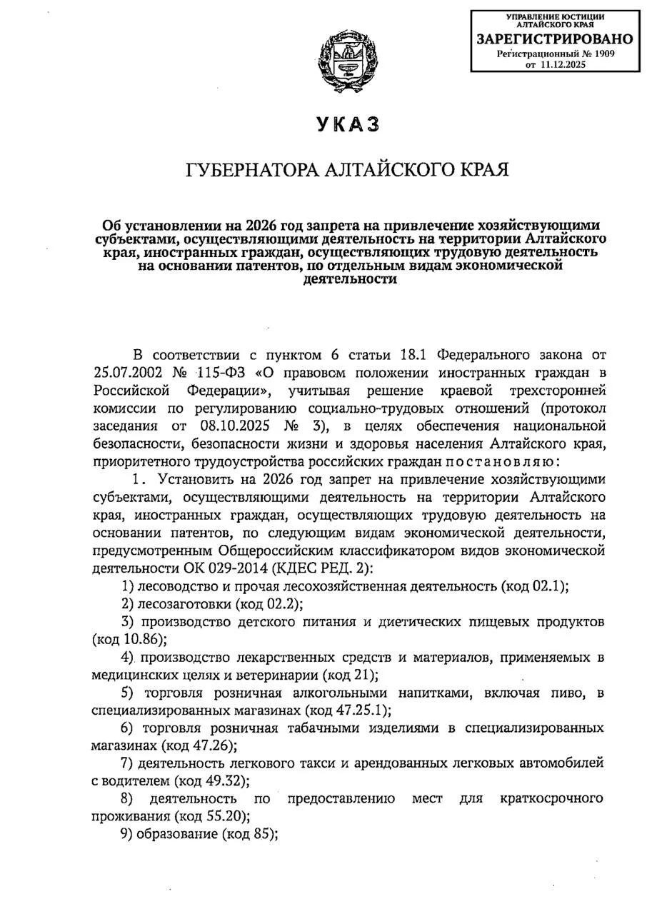 🚫🌲🚕В Алтайском крае снова запретили нанимать иностранцев на работу