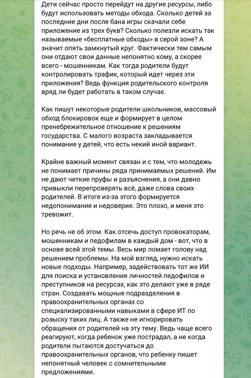 🤔Екатерина Мизулина раскритиковала блокировку популярных игр и сервисов, заявив, что детям не объясняют причины ограничений и не предлагают доступных офлайн-альтернатив, из-за чего они переходят на VPN