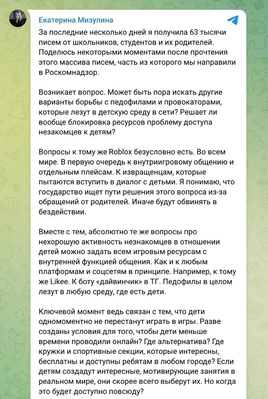 По её словам, за несколько дней она получила 63 тысячи писем от школьников и родителей. Она подчёркивает: проблемы есть у любых платформ, а блокировки не защищают детей.
