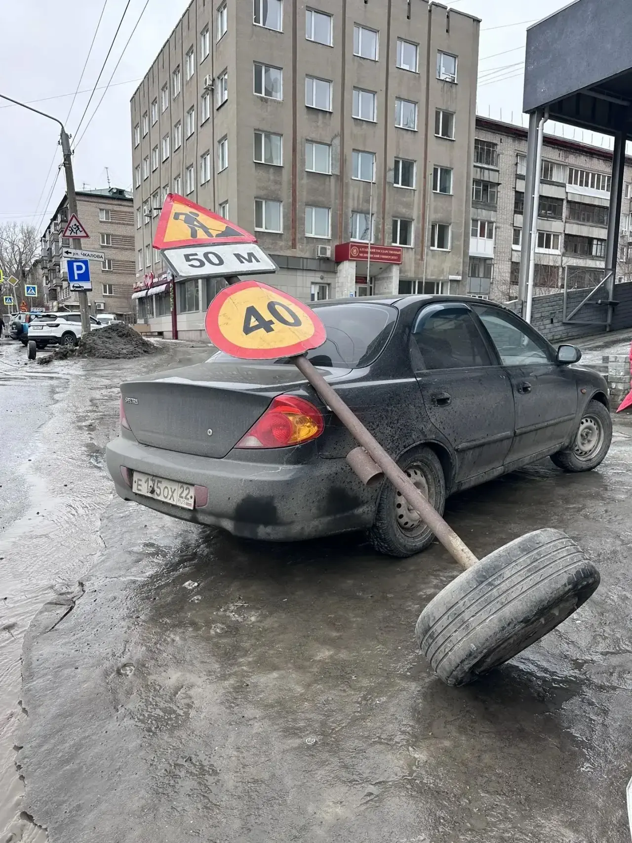 Один из инцидентов произошел в центре города, рядом с домом № 80е на проспекте Комсомольском. Дорожный знак рухнул на припаркованную машину.