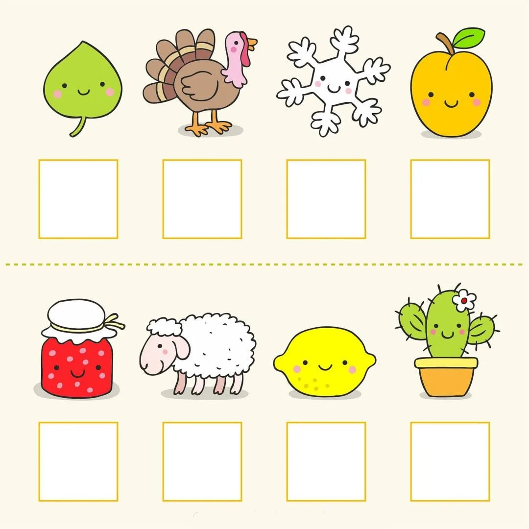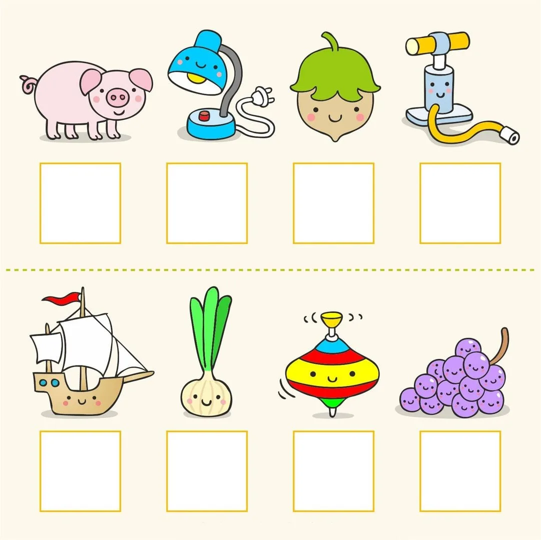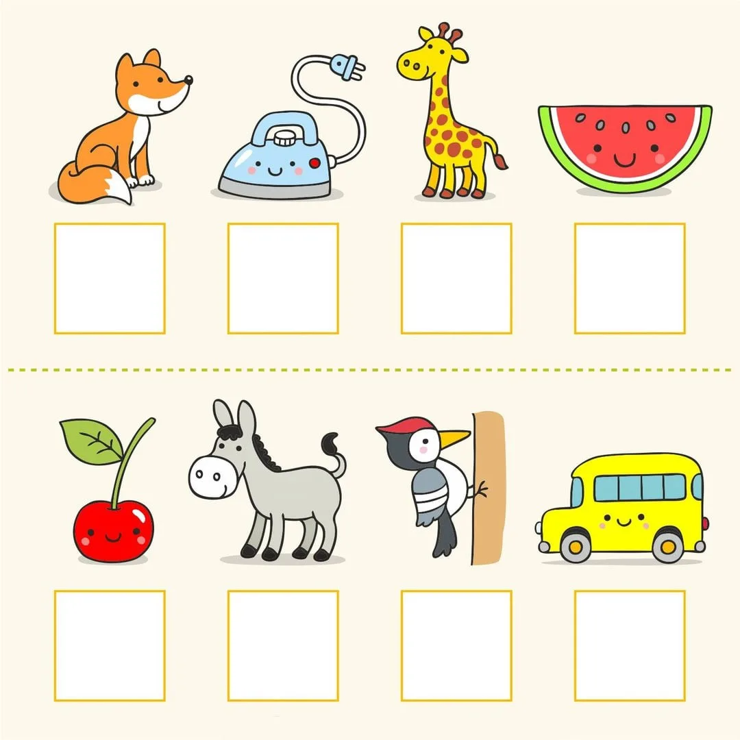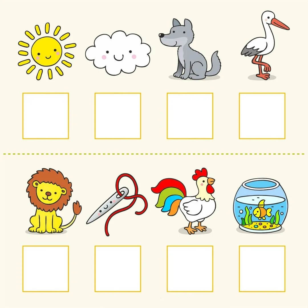Задача: с помощью первых букв, изображенных на картинках предметов и животных, составить слова.