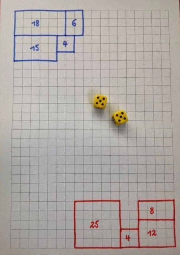 На своей стороне листа рисует прямоугольник с длинной и шириной во столько клеток, сколько выпало на кубиках. Например, выпали числа 5 и 3. Рисуем прямоугольник 5 на 3 клетки. Рисовать прямоугольники нужно начиная с правого угла своей стороны листа.