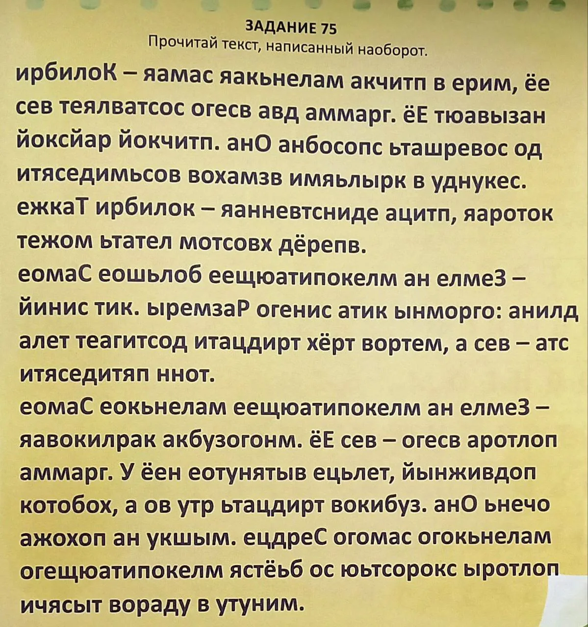 Задание: читать каждое слово справа налево, а сам текст слева направо.