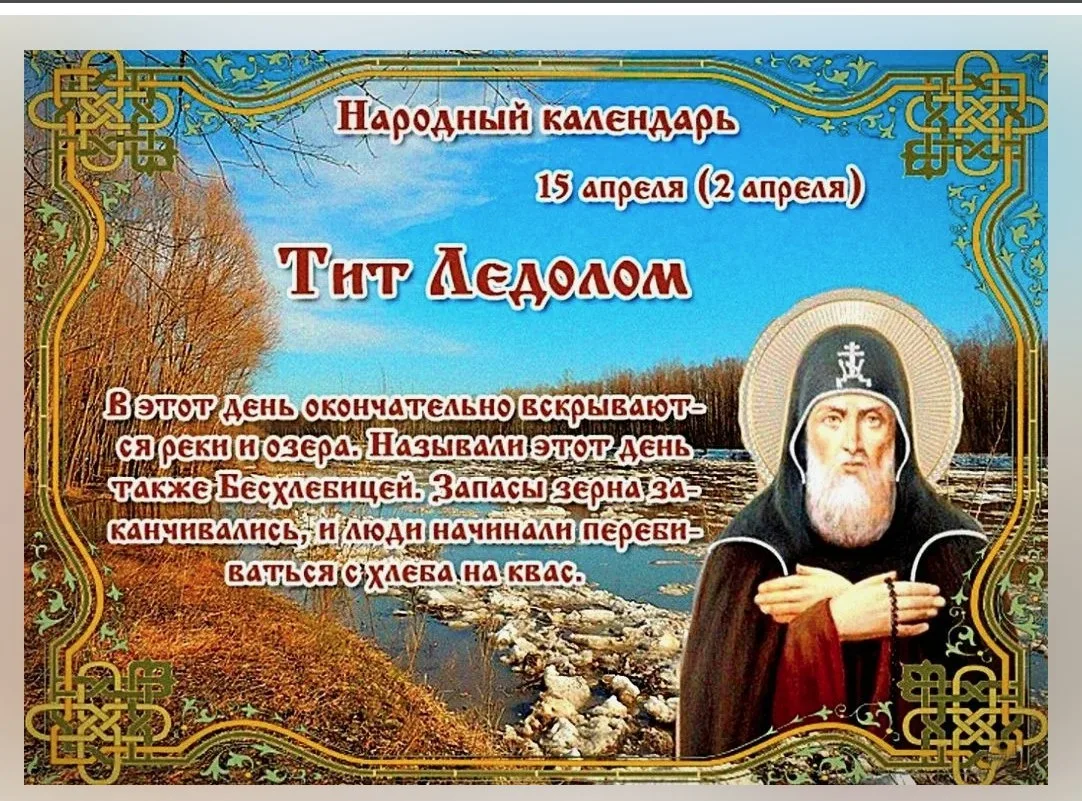 15 апреля 2026 года отмечается день Тита Ледолома, православная церковь чтит преподобного Тита Чудотворца. В народе этот день также известен как Бесхлебица и Барыш-день.