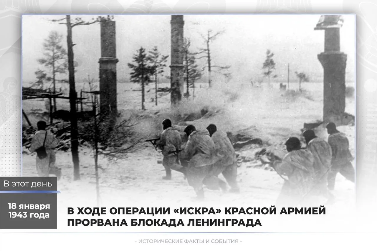 Операция по освобождению Ленинграда, получившая название «Искра», началась утром 12 января 1943 года. В ней принимали участие Ленинградский и Волховский фронты, которые прорвали германскую оборону на Шлиссельбургско-Синявинском выступе и соединились 18 января 1943 года в районе Рабочего поселка №1.