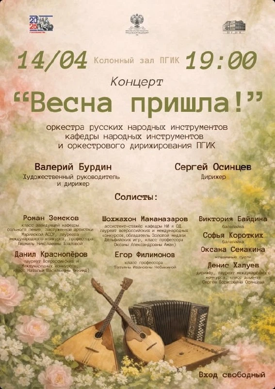 Гостей приглашают на концерт оркестра русских народных инструментов кафедры народных инструментов и оркестрового дирижирования Пермского государственного института культуры.