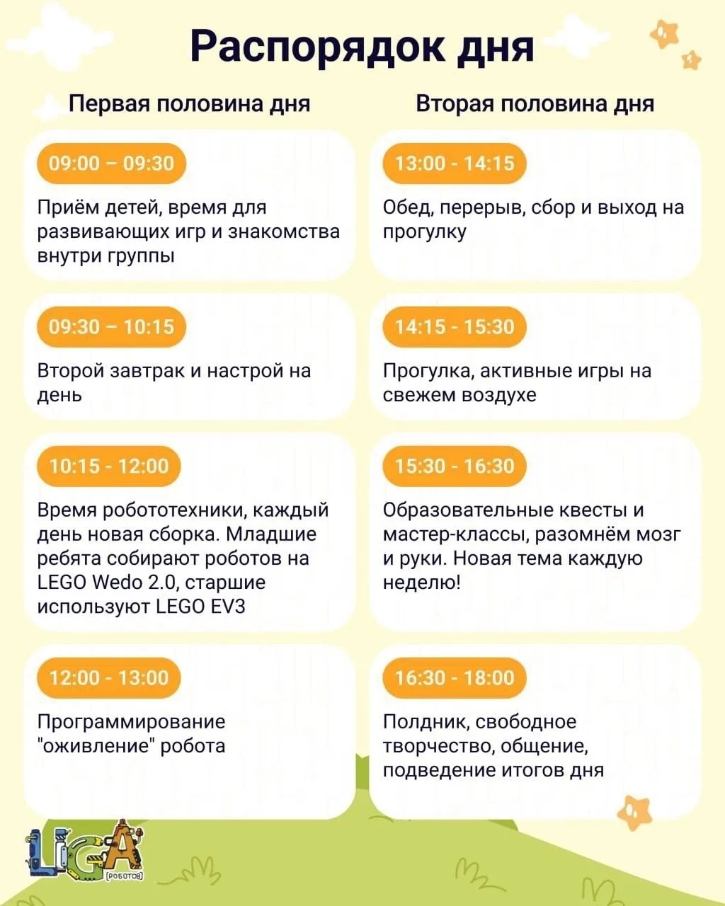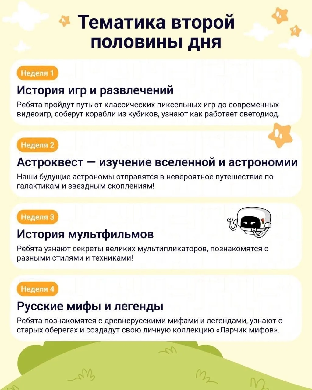 🤖 Каждый день ребята будут заниматься робототехникой, программированием и знакомством с новыми технологиями! После обеда — прогулки, игры и тематические мастер-классы 🔥