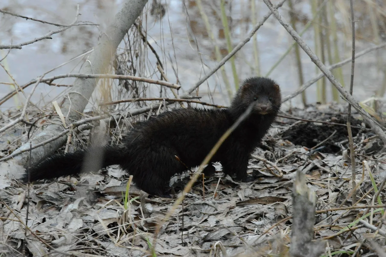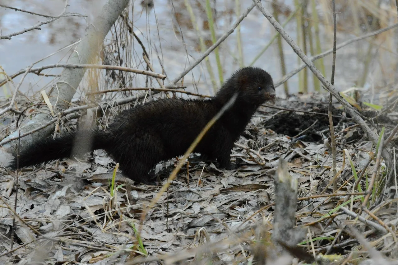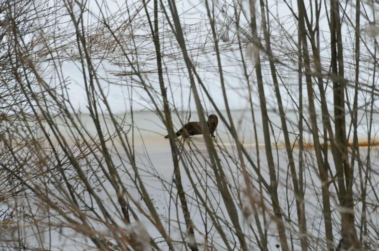 Интересная встреча произошла у нас на днях на болотах Красавы. Следы норки мы встречали зимой и видели ее издалека пару лет назад. А тут зверек вышел на лед, переплыл канал. Нас он отлично видел, но вел себя, как хозяин этих мест и не спешил убегать. Копошился в кустах, не обращая на нас внимания. Пермский край.